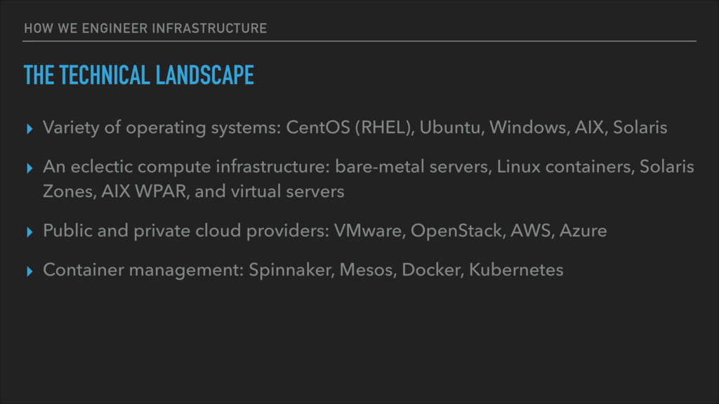 operating systems: CentOS (RHEL), Ubuntu, Windows, AIX, Solaris ▸ An eclectic compute infrastructure: bare-metal servers, Linux containers, Solaris Zones, AIX WPAR, and virtual servers ▸ Public and private cloud providers: VMware, OpenStack, AWS, Azure ▸ Container management: Spinnaker, Mesos, Docker, Kubernetes