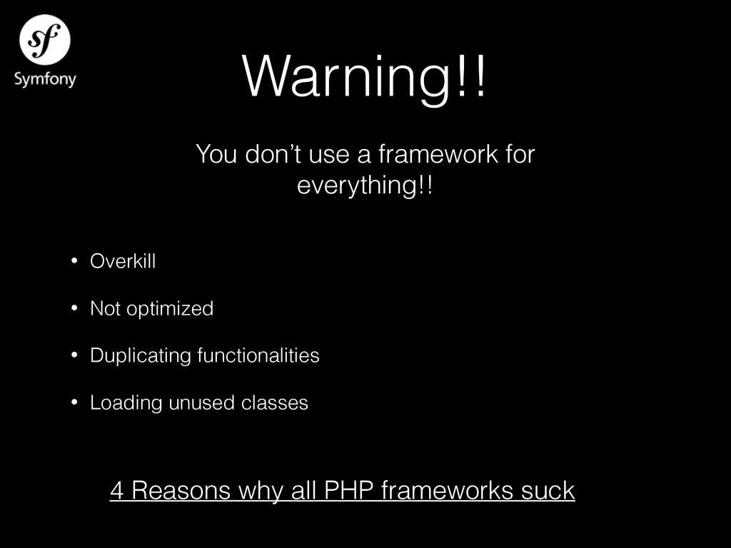 why all PHP frameworks suck • Overkill • Not optimized • Duplicating functionalities • Loading unused classes