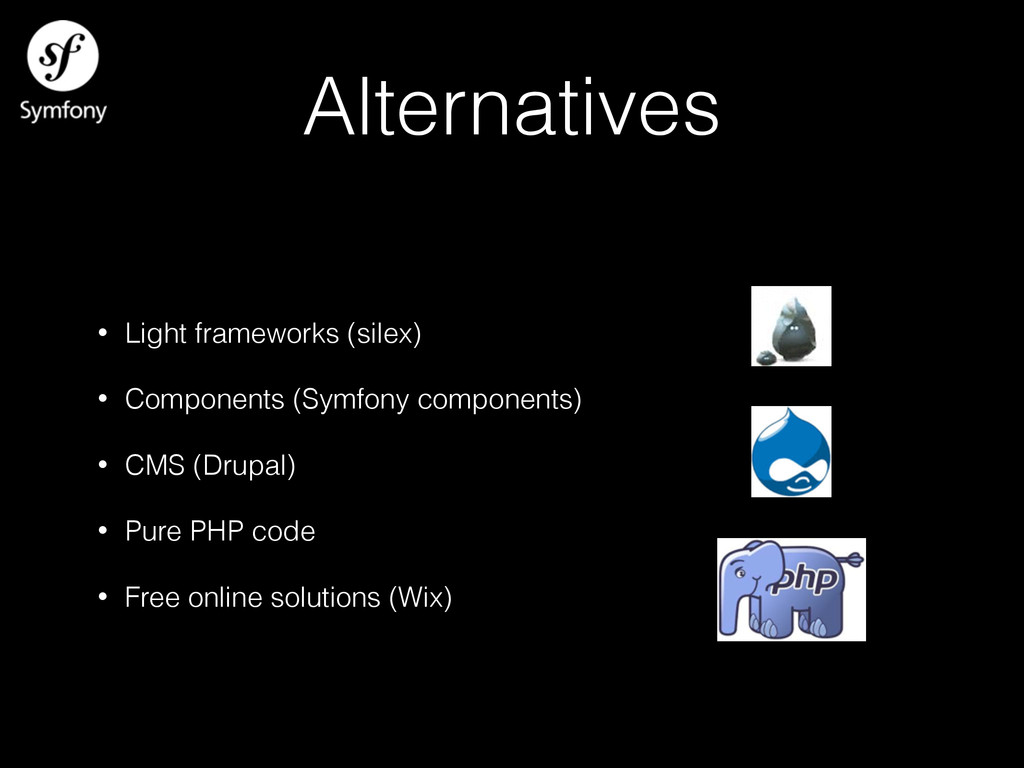 Alternatives • Light frameworks (silex) • Components (Symfony components) •