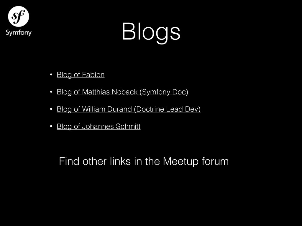 (Symfony Doc) • Blog of William Durand (Doctrine Lead Dev) • Blog of Johannes Schmitt Find other links in the Meetup forum