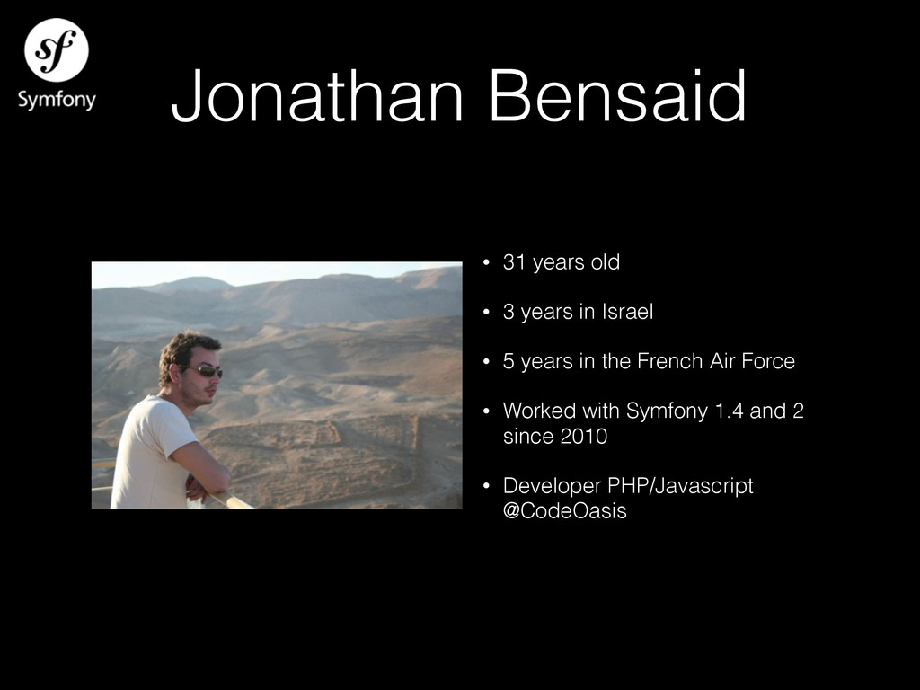 Israel • 5 years in the French Air Force • Worked with Symfony 1.4 and 2 since 2010 • Developer PHP/Javascript @CodeOasis
