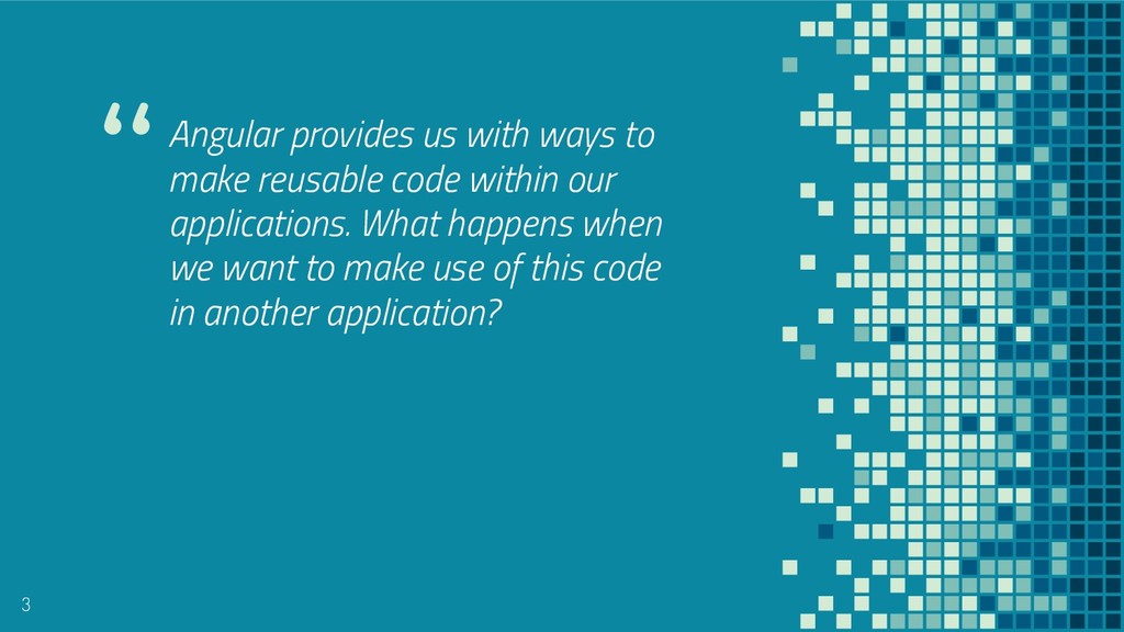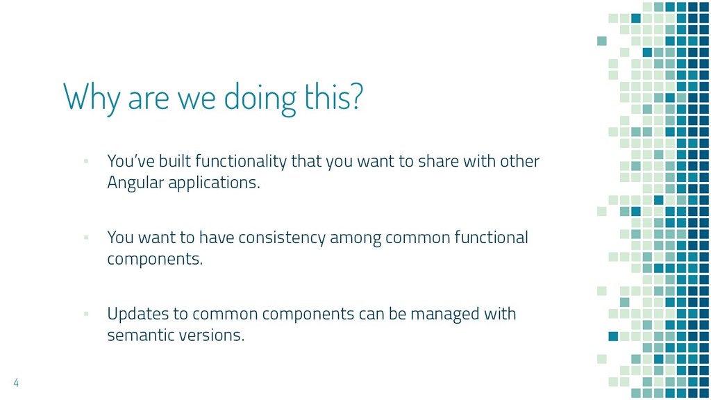 Angular provides us with ways to make reusable code within our applications. What happens when we want to make use of this code in another application? In this session we will cover how to take an existing piece of reusable logic and abstract it to a shared Angular package.