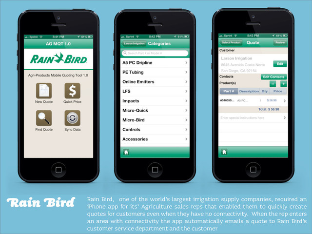 supply companies, required an iPhone app for its’ Agriculture sales reps that enabled them to quickly create quotes for customers even when they have no connectivity. When the rep enters an area with connectivity the app automatically emails a quote to Rain Bird’s customer service department and the customer