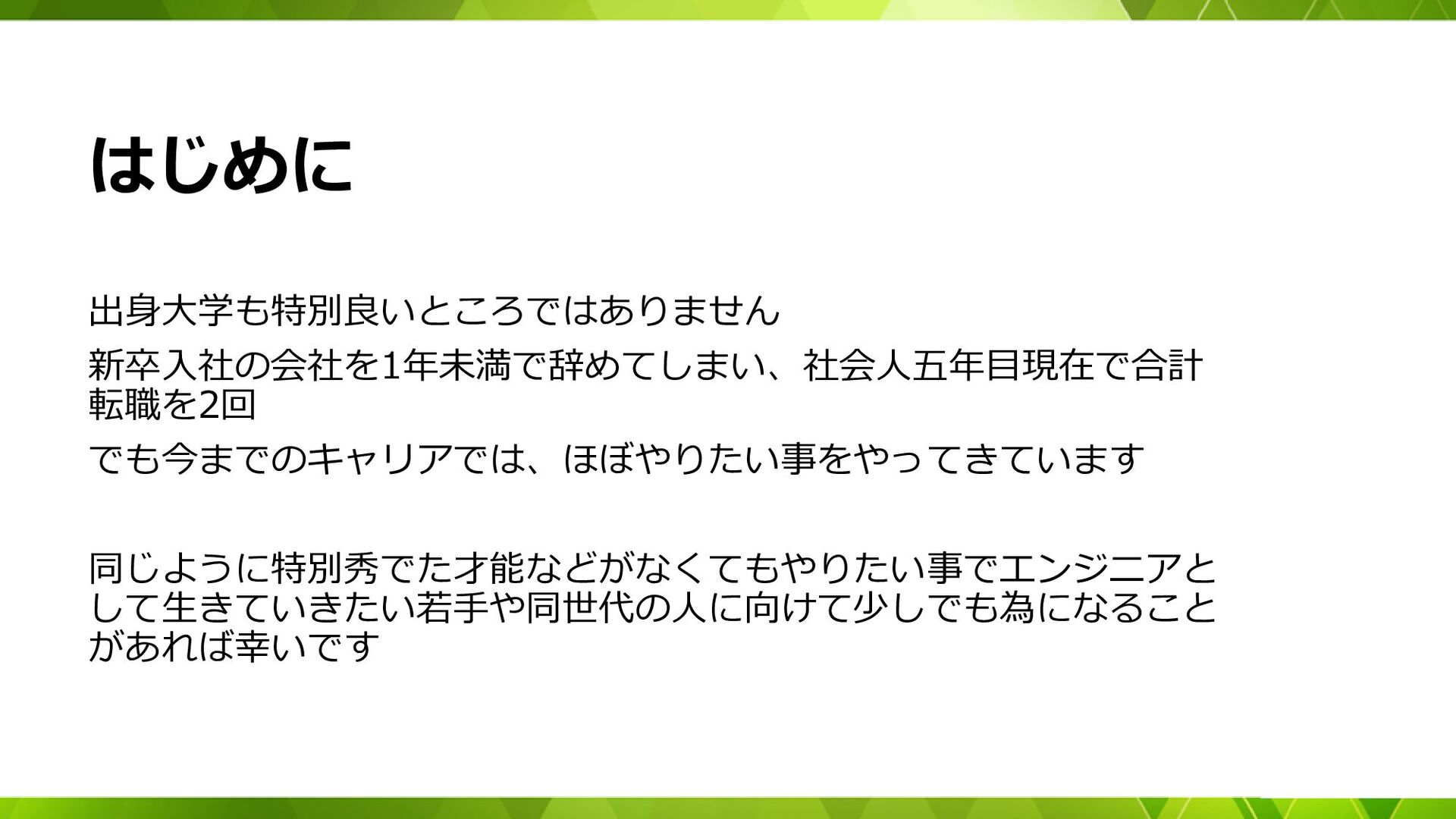 はじめに 出身大学も特別良いところではありません 新卒入社の会社を1年未満で辞めてしまい、社会人五年目現在で合計 転職を2回 でも今までのキャリアでは、ほぼやりたい事をやってきています 同じように特別秀でた才能などがなくてもやりたい事でエンジニアと して生きていきたい若手や同世代の人に向けて少しでも為になること があれば幸いです 3
