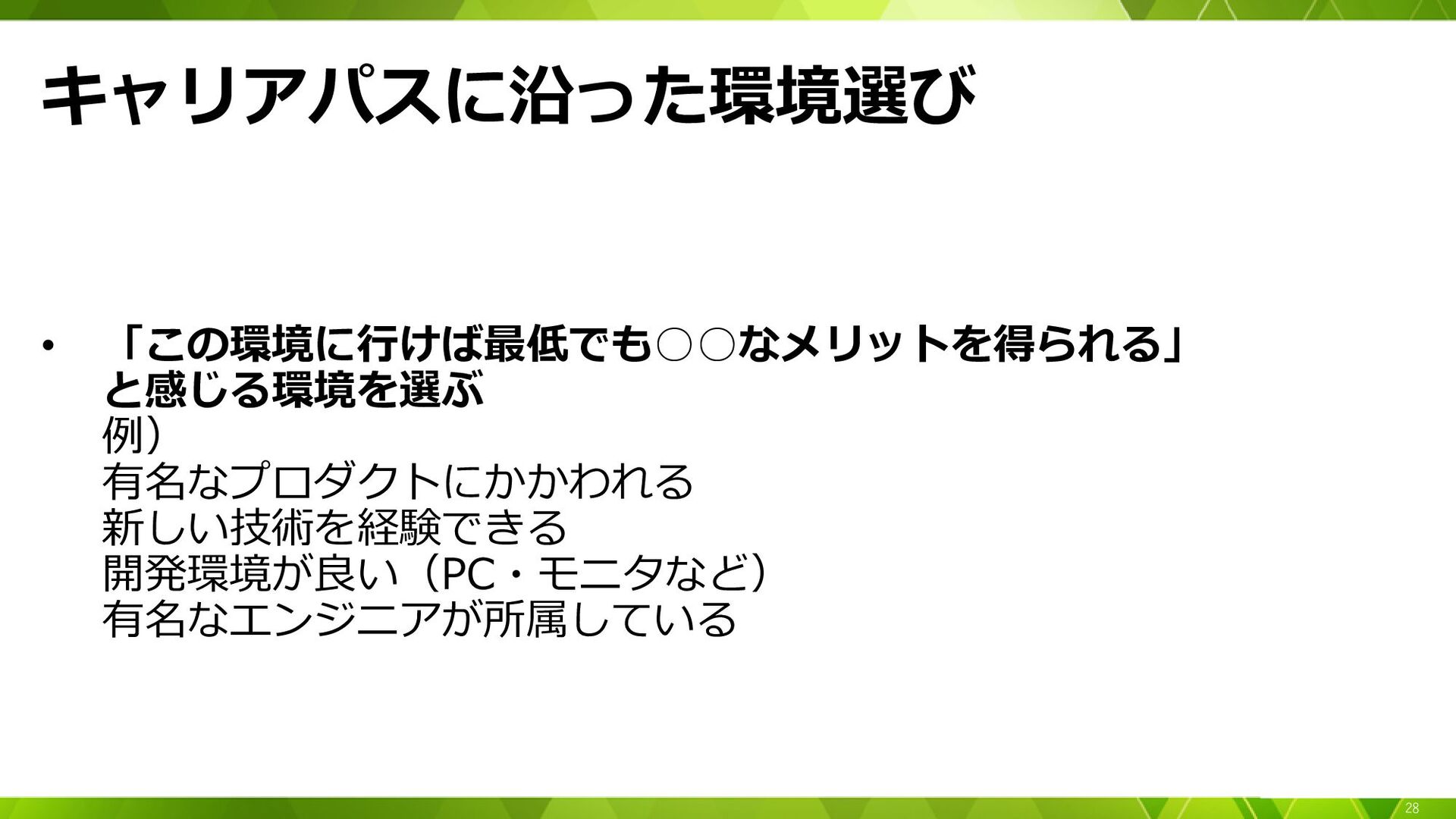 キャリアパスに沿った環境選び • 「この環境に行けば最低でも◦◦なメリットを得られる」 と感じる環境を選ぶ 例) 有名なプロダクトにかかわれる 新しい技術を経験できる 開発環境が良い(PC・モニタなど) 有名なエンジニアが所属している 28