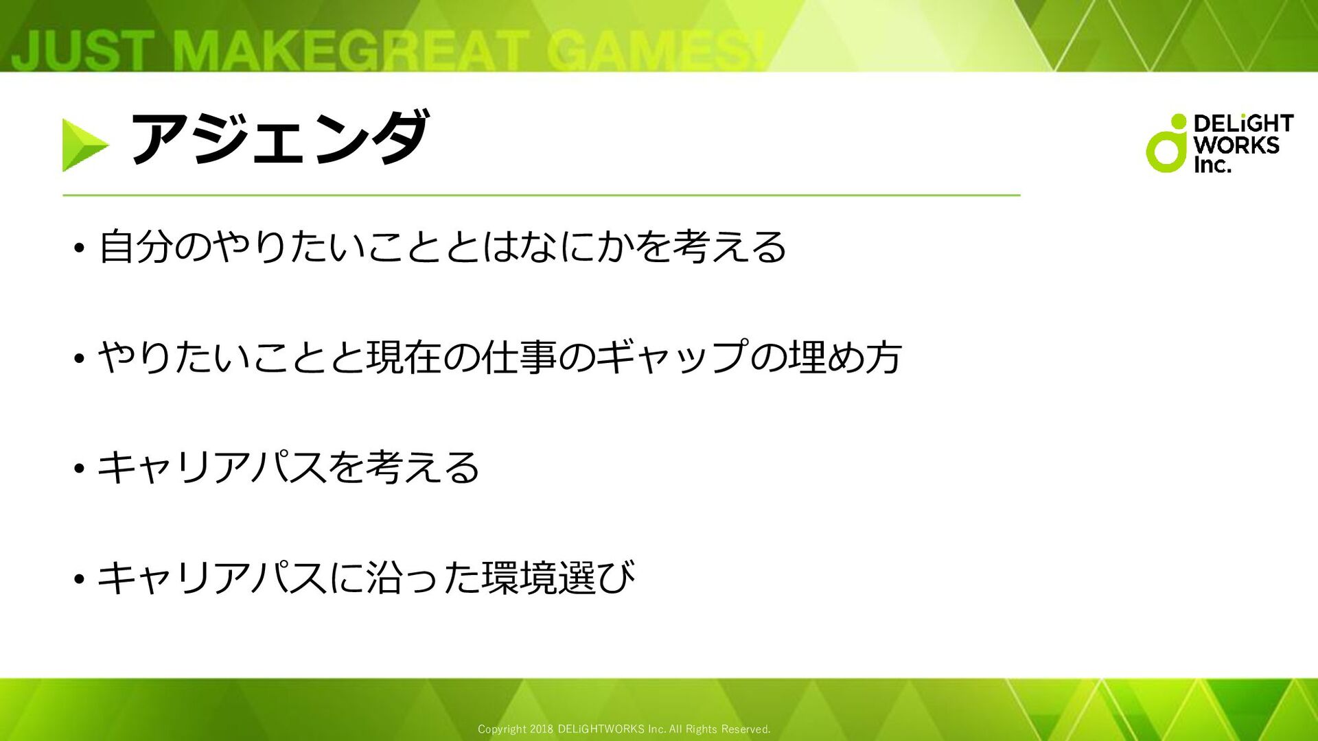 Copyright 2018 DELiGHTWORKS Inc. All Rights Reserved. アジェンダ • 自分のやりたいこととはなにかを考える