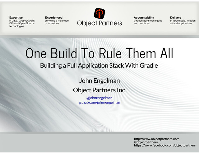 Use a single repository to host your micro-service, application portal, and client front end and use a single Gradle build to compile, test, and build all your artifacts. This presentation covers integrating a Dropwizard service, a Grails application, and AngularJS client side in a single Gradle build.