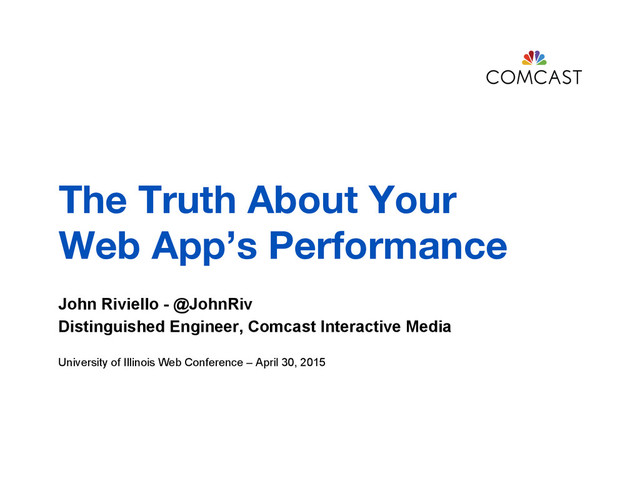 The performance of your web app is obviously important. But how do you know your web app is performing well for all of your users? Out of the box tools provide us metrics, but most only provide an overall view. This case study of building the XFINITY X1 single-page web app will demonstrate what frontend performance data should you be gathering, how to gather it, and how to make sense of all that data. In this talk, we'll walk through the parts of the W3C Navigation Timing, High Resolution Time & User Timing recommendations that you can take advantage of right now to collect important metrics. We'll determine the "types" of users you need to focus on to understand YOUR web app, as well as what other factors could impact those individual users' experience. And we'll make sure "Average Response Time" is never the primary focus of your metrics dashboard.