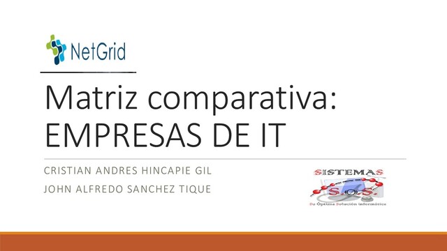 ¿Como enfrentamos los cambios? ¿Como me veo? NETGRID Responsabilidad Mística Calidad Creatividad Confianza Marcaremos la diferencia, generaremos tranquilidad, confianza, bajo un constante avance tecnológico de una variada cartera de productos y servicios de calidad. Trabajo duro, en equipo, honesto y leal, haciendo uso de altos estándares que siempre superen las expectativas. Una empresa que se anticipe a los cambios, satisfaciendo los deseos de los clientes. SISTEMAS S.O.S. Honestidad. Respeto. Perseverancia. Responsabilidad. Gratitud. Eficiencia. Trabajo en equipo. Ser reconocida como una de los mejores prestadores de servicios integrales y outsourcing para equipos de computo en reparación, optimización, rendimiento, mantenimiento y todo lo relacionado con el ámbito de la Informática. Para ello abarcaremos todos los servicios que ofrecemos actualmente incrementando los que vayan surgiendo debido a la necesidad de cambio provocado por los avances tecnológicos. Adquiriendo un compromiso con la competitividad y el desarrollo socioeconómico del país.