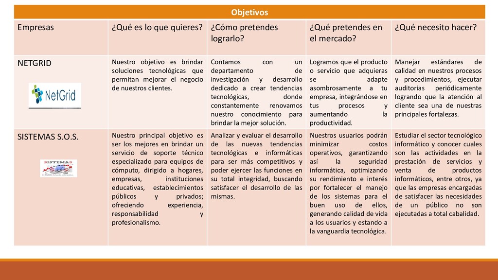 ¿Qué pretendes en el mercado? ¿Qué necesito hacer? NETGRID Nuestro objetivo es brindar soluciones tecnológicas que permitan mejorar el negocio de nuestros clientes. Contamos con un departamento de investigación y desarrollo dedicado a crear tendencias tecnológicas, donde constantemente renovamos nuestro conocimiento para brindar la mejor solución. Logramos que el producto o servicio que adquieras se adapte asombrosamente a tu empresa, integrándose en tus procesos y aumentando la productividad. Manejar estándares de calidad en nuestros procesos y procedimientos, ejecutar auditorias periódicamente logrando que la atención al cliente sea una de nuestras principales fortalezas. SISTEMAS S.O.S. Nuestro principal objetivo es ser los mejores en brindar un servicio de soporte técnico especializado para equipos de cómputo, dirigido a hogares, empresas, instituciones educativas, establecimientos públicos y privados; ofreciendo experiencia, responsabilidad y profesionalismo. Analizar y evaluar el desarrollo de las nuevas tendencias tecnológicas e informáticas para ser más competitivos y poder ejercer las funciones en su total integridad, buscando satisfacer el desarrollo de las mismas. Nuestros usuarios podrán minimizar costos operativos, garantizando así la seguridad informática, optimizando su rendimiento e interés por fortalecer el manejo de los sistemas para el buen uso de ellos, generando calidad de vida a los usuarios y estando a la vanguardia tecnológica. Estudiar el sector tecnológico informático y conocer cuales son las actividades en la prestación de servicios y venta de productos informáticos, entre otros, ya que las empresas encargadas de satisfacer las necesidades de un público no son ejecutadas a total cabalidad.