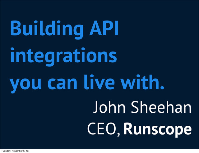 c.cassette_library_dir = 'fixtures/vcr_cassettes' c.hook_into :webmock # or :fakeweb end class VCRTest < Test::Unit::TestCase def test_example_dot_com VCR.use_cassette('synopsis') do url = 'http://yourapihere.com' response = Net::HTTP.get_response(URI(url)) assert_match /Example domains/, response.body end end end VCR github.com/vcr/vcr Tuesday, November 5, 13