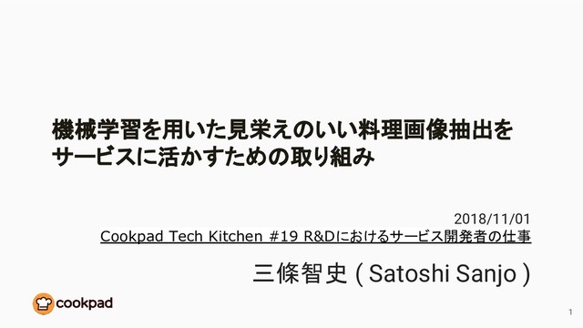 機械学習を用いた見栄えのいい料理画像抽出を サービスに活かすための取り組み 2018/11/01 Cookpad Tech Kitchen #19 R&Dにおけるサービス開発者の仕事 三條智史 (