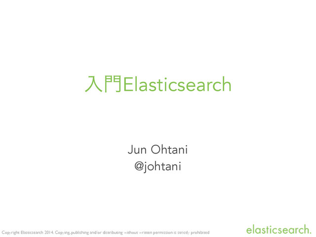 is strictly prohibited Search » curl -XGET localhost:9200/bookstore/_search?q=elasticsearch { "took" : 2, "timed_out" : false, "_shards" : { "total" : 5, "successful" : 5, "failed" : 0 }, "hits" : { "total" : 1, "max_score" : 0.076713204, "hits" : [ { "_index" : “books", "_type" : “book", "_id" : "1", "_score" : 0.076713204, "_source" : { "title" : "ElasticSearch Serverຊޠ൛", "authors" : [ “Jun Ohtani", “Genta Kaneyama" ], "started" : “2013-07-17", "pages" :336 } } ] } }