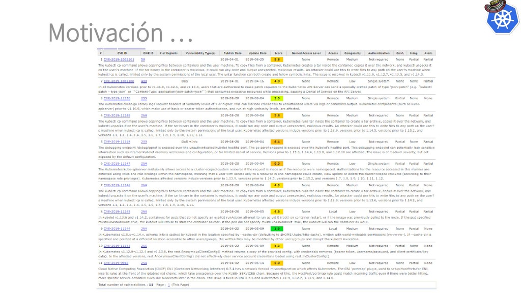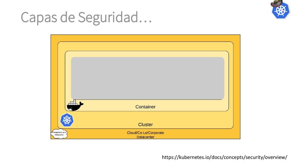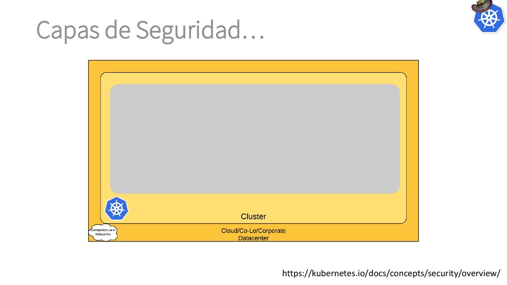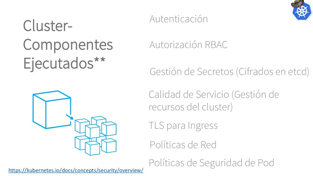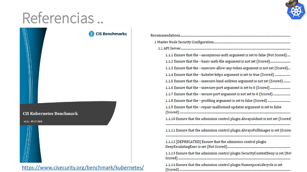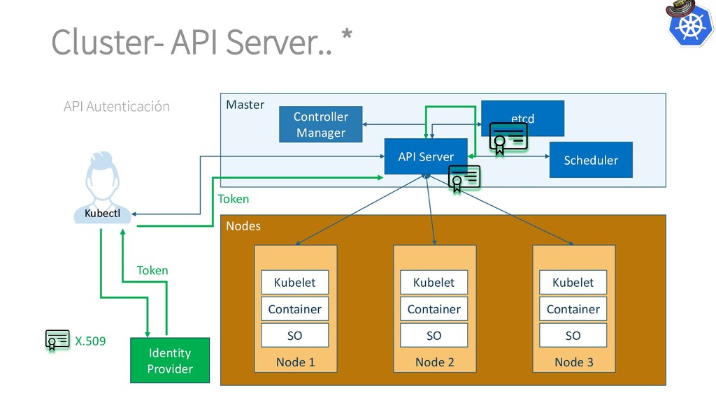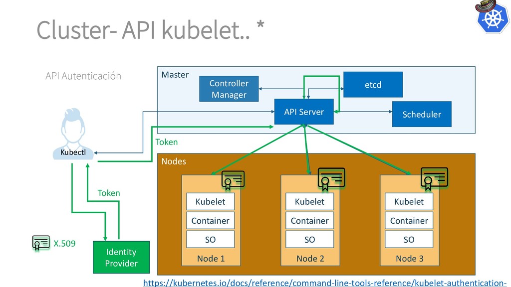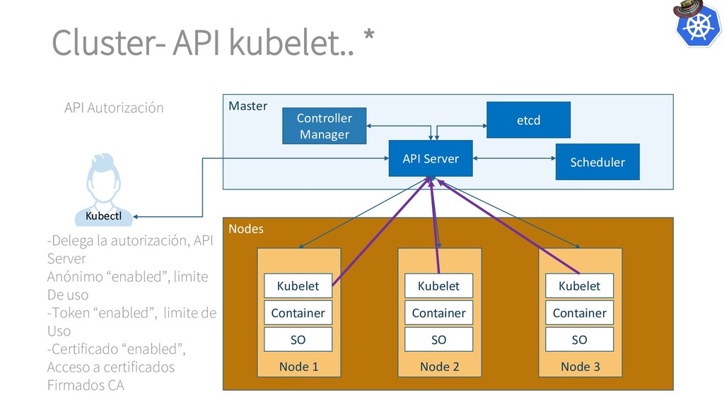 etcd Scheduler Node 1 SO Container Controller Manager Kubelet Node 2 SO Container Kubelet Node 3 SO Container Kubelet Kubectl API -Delega la autorización, API Server Anónimo “enabled”, limite De uso -Token “enabled”, limite de Uso -Certificado “enabled”, Acceso a certificados Firmados CA