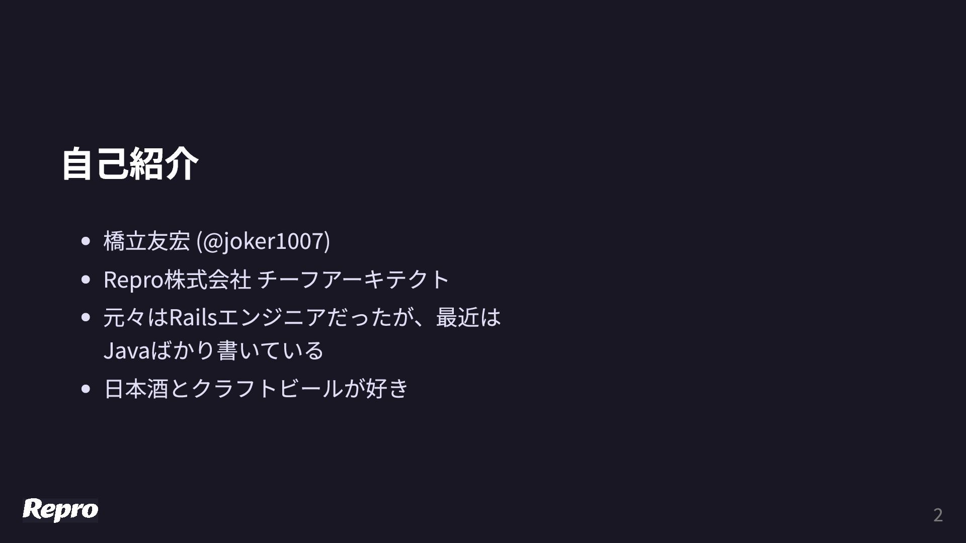 自己紹介 橋立友宏 (@joker1007) Repro株式会社 チーフアーキテクト 元々はRailsエンジニアだったが、最近は Javaばかり書いている 日本酒とクラフトビールが好き 2