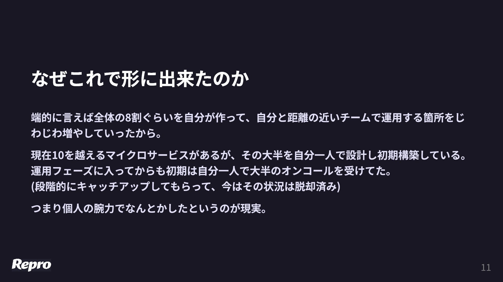 なぜこれで形に出来たのか 端的に言えば全体の8割ぐらいを自分が作って、自分と距離の近いチームで運用する箇所をじ わじわ増やしていったから。 現在10を越えるマイクロサービスがあるが、その大半を自分一人で設計し初期構築している。 運用フェーズに入ってからも初期は自分一人で大半のオンコールを受けてた。 (段階的にキャッチアップしてもらって、今はその状況は脱却済み) つまり個人の腕力でなんとかしたというのが現実。 11