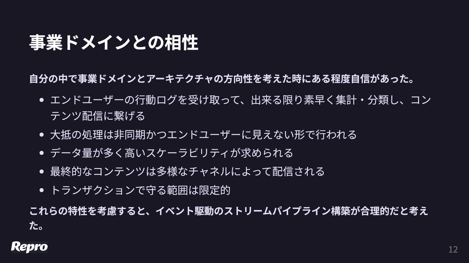 事業ドメインとの相性 自分の中で事業ドメインとアーキテクチャの方向性を考えた時にある程度自信があった。 エンドユーザーの行動ログを受け取って、出来る限り素早く集計・分類し、コン テンツ配信に繋げる 大抵の処理は非同期かつエンドユーザーに見えない形で行われる データ量が多く高いスケーラビリティが求められる 最終的なコンテンツは多様なチャネルによって配信される トランザクションで守る範囲は限定的 これらの特性を考慮すると、イベント駆動のストリームパイプライン構築が合理的だと考え た。