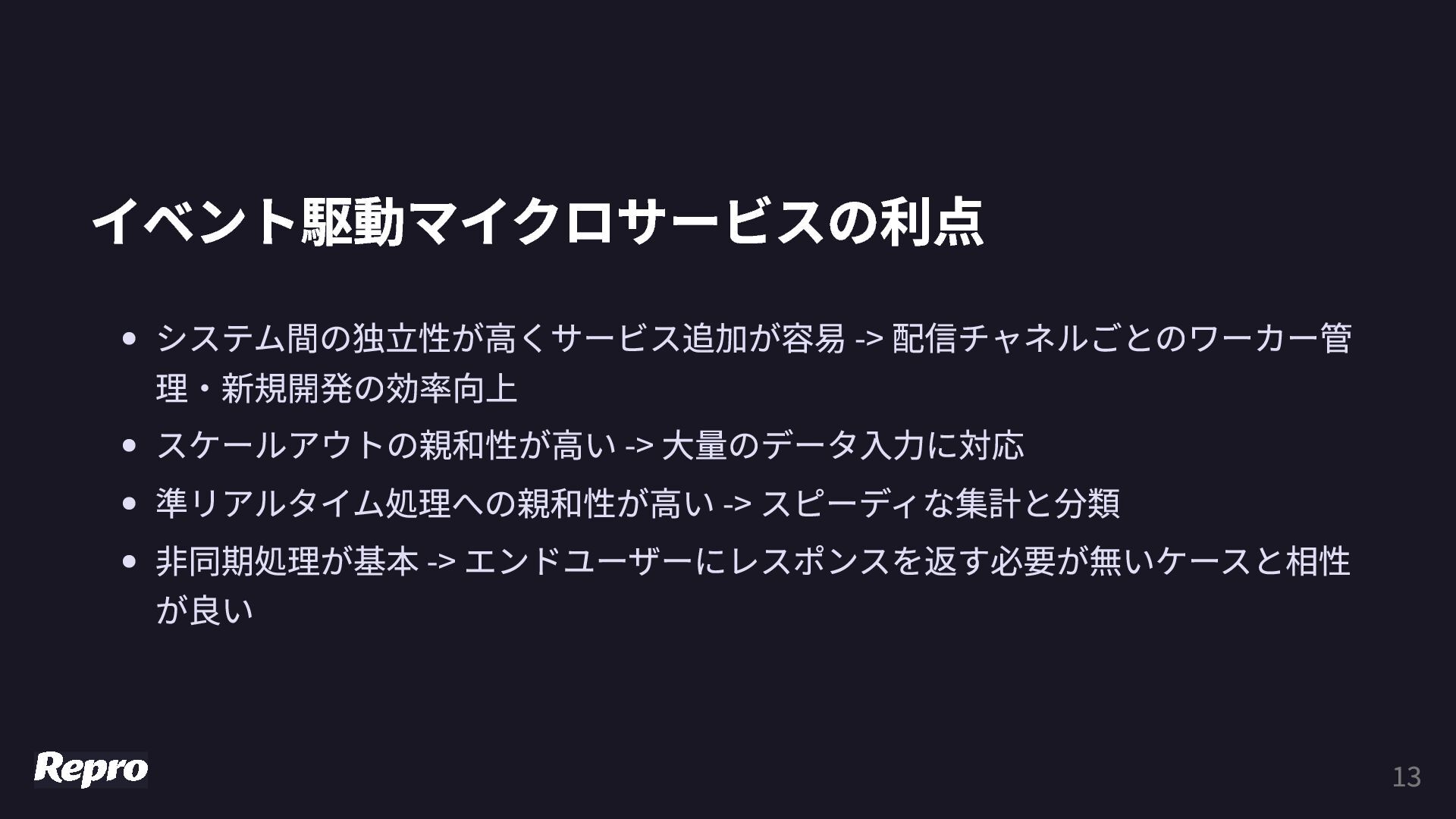 イベント駆動マイクロサービスの利点 システム間の独立性が高くサービス追加が容易 -> 配信チャネルごとのワーカー管 理・新規開発の効率向上 スケールアウトの親和性が高い -> 大量のデータ入力に対応 準リアルタイム処理への親和性が高い ->