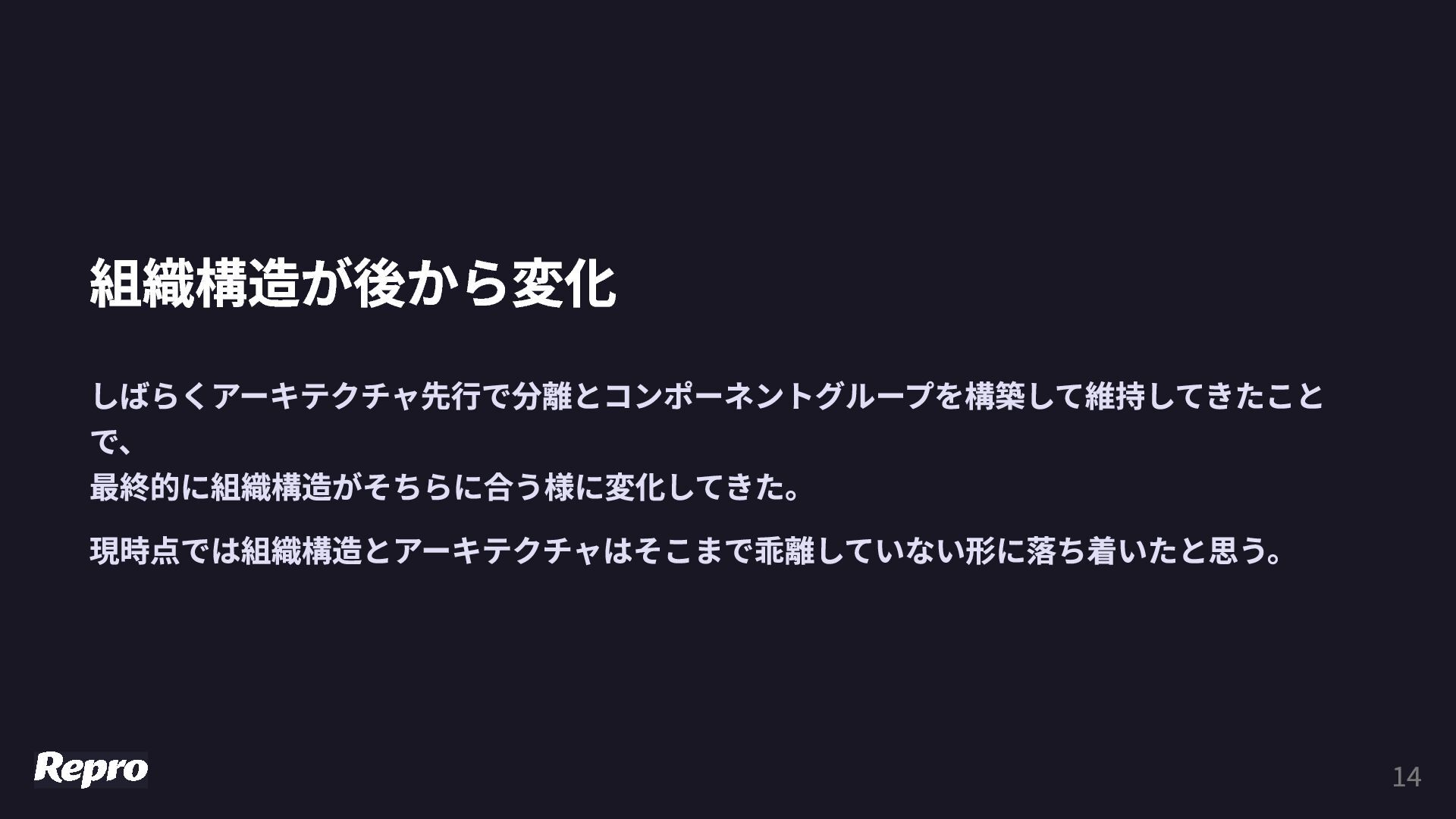 組織構造が後から変化 しばらくアーキテクチャ先行で分離とコンポーネントグループを構築して維持してきたこと で、 最終的に組織構造がそちらに合う様に変化してきた。 現時点では組織構造とアーキテクチャはそこまで乖離していない形に落ち着いたと思う。 14