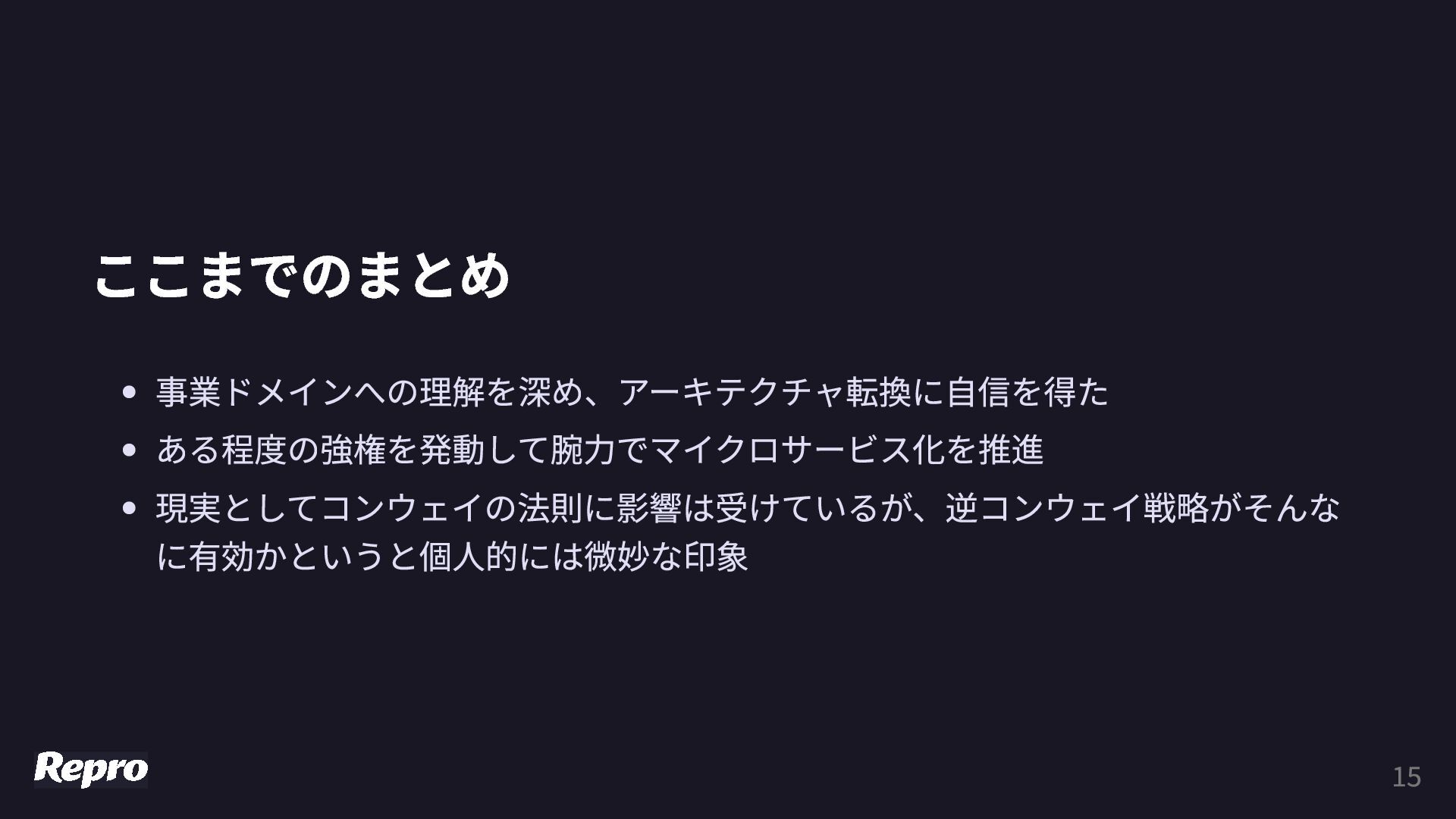 ここまでのまとめ 事業ドメインへの理解を深め、アーキテクチャ転換に自信を得た ある程度の強権を発動して腕力でマイクロサービス化を推進 現実としてコンウェイの法則に影響は受けているが、逆コンウェイ戦略がそんな に有効かというと個人的には微妙な印象 15