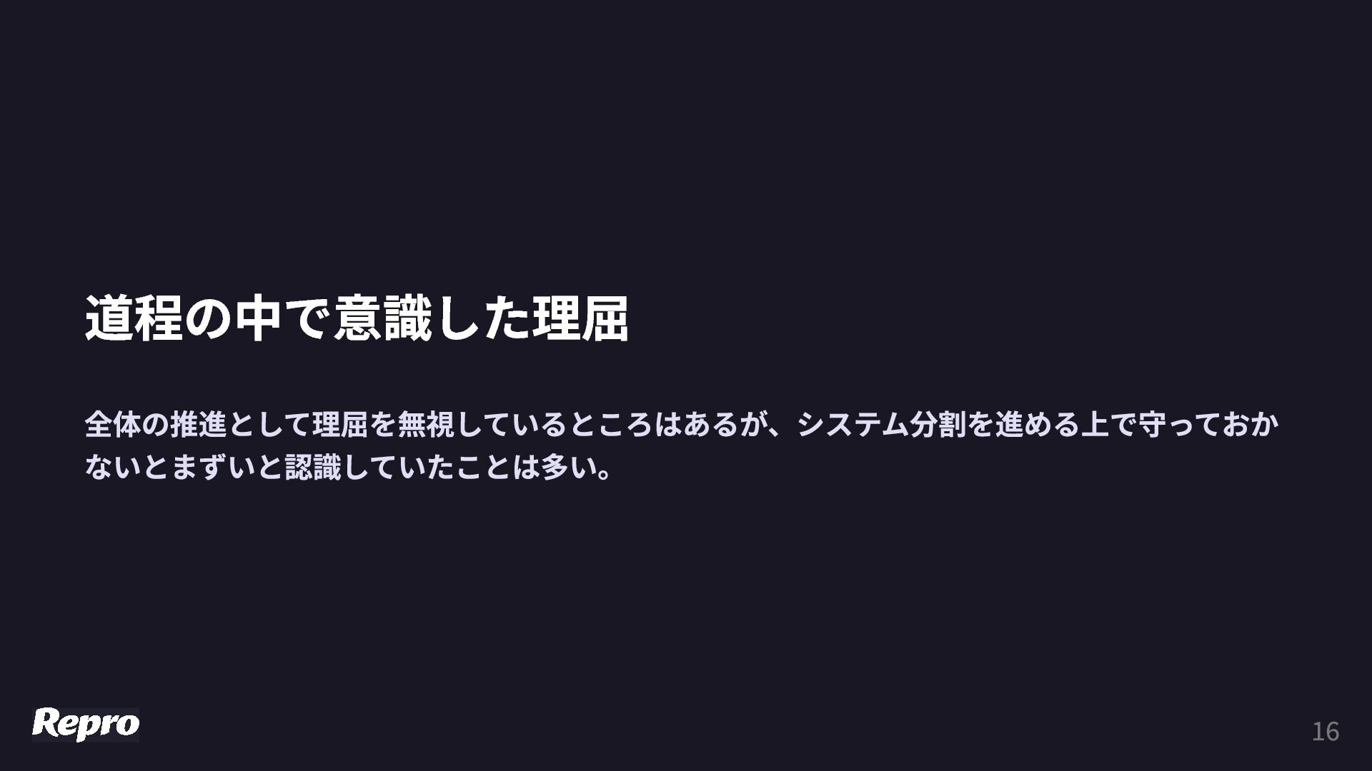 道程の中で意識した理屈 全体の推進として理屈を無視しているところはあるが、システム分割を進める上で守っておか ないとまずいと認識していたことは多い。 16