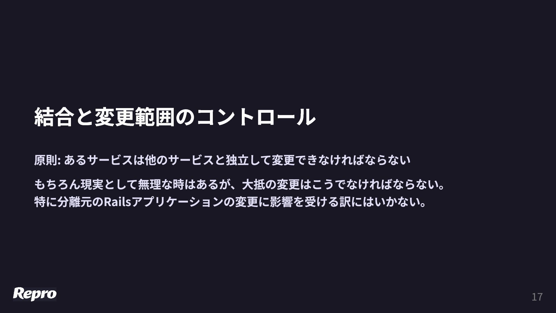 結合と変更範囲のコントロール 原則: あるサービスは他のサービスと独立して変更できなければならない もちろん現実として無理な時はあるが、大抵の変更はこうでなければならない。 特に分離元のRailsアプリケーションの変更に影響を受ける訳にはいかない。 17