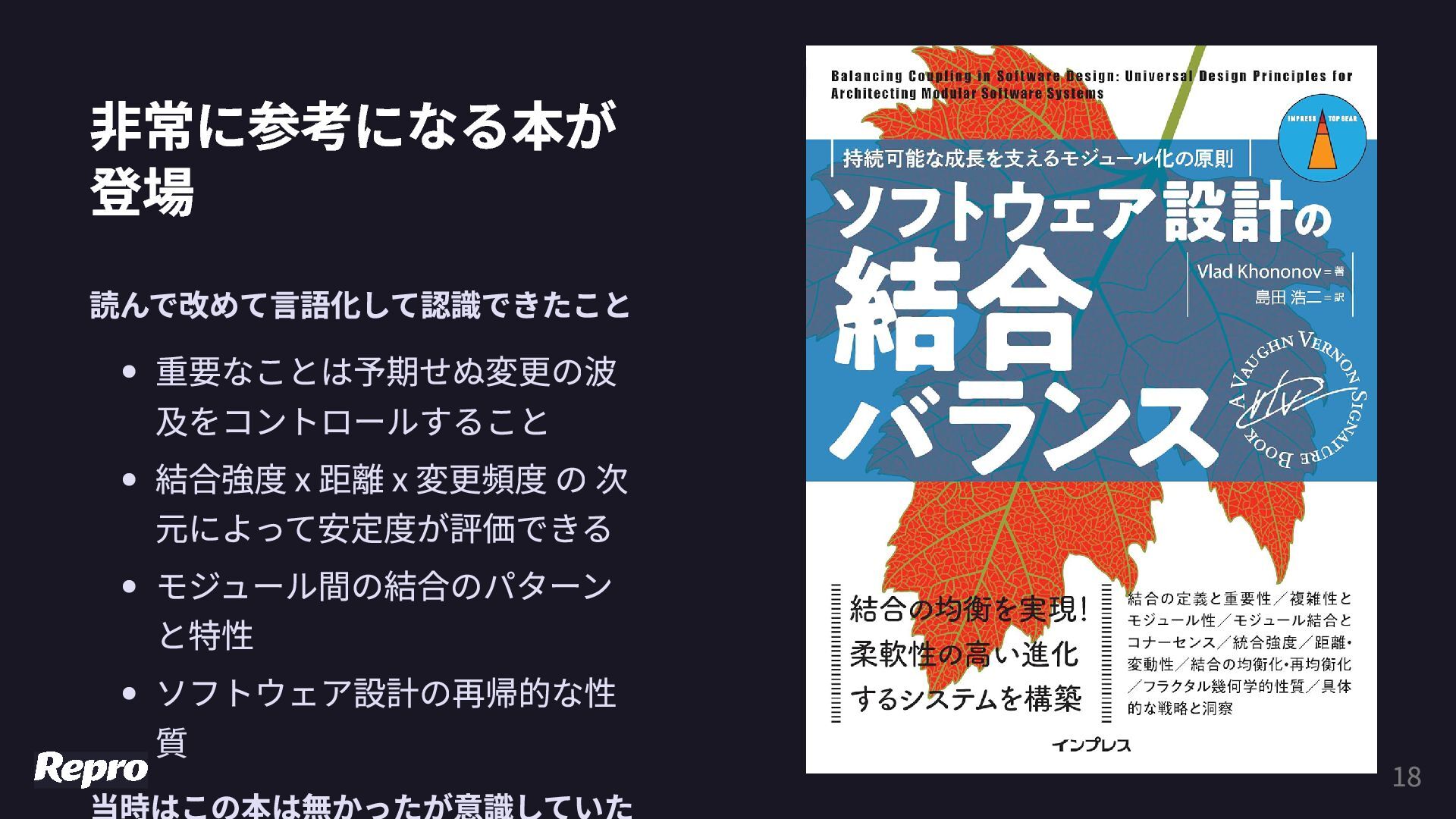 非常に参考になる本が 登場 読んで改めて言語化して認識できたこと 重要なことは予期せぬ変更の波 及をコントロールすること 結合強度 x 距離 x 変更頻度