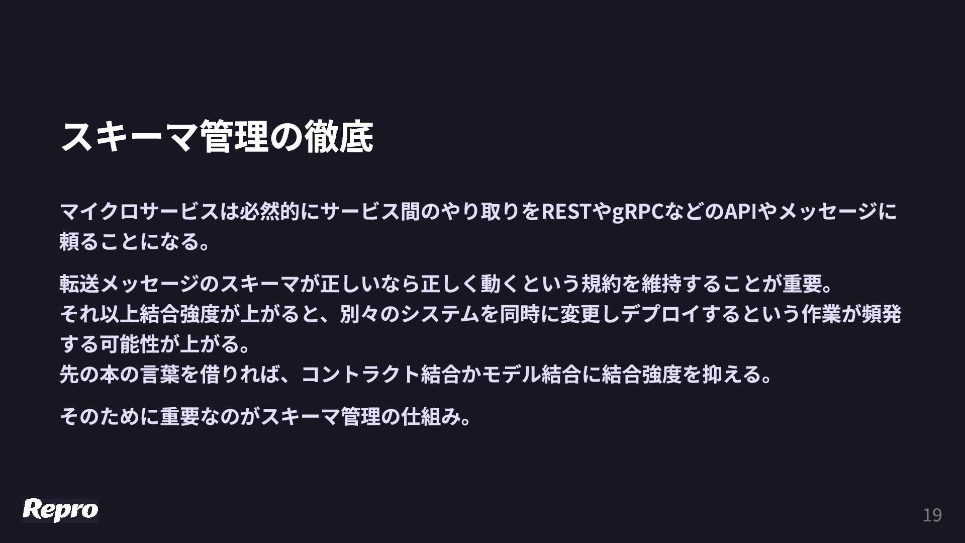 スキーマ管理の徹底 マイクロサービスは必然的にサービス間のやり取りをRESTやgRPCなどのAPIやメッセージに 頼ることになる。 転送メッセージのスキーマが正しいなら正しく動くという規約を維持することが重要。 それ以上結合強度が上がると、別々のシステムを同時に変更しデプロイするという作業が頻発 する可能性が上がる。 先の本の言葉を借りれば、コントラクト結合かモデル結合に結合強度を抑える。 そのために重要なのがスキーマ管理の仕組み。 19