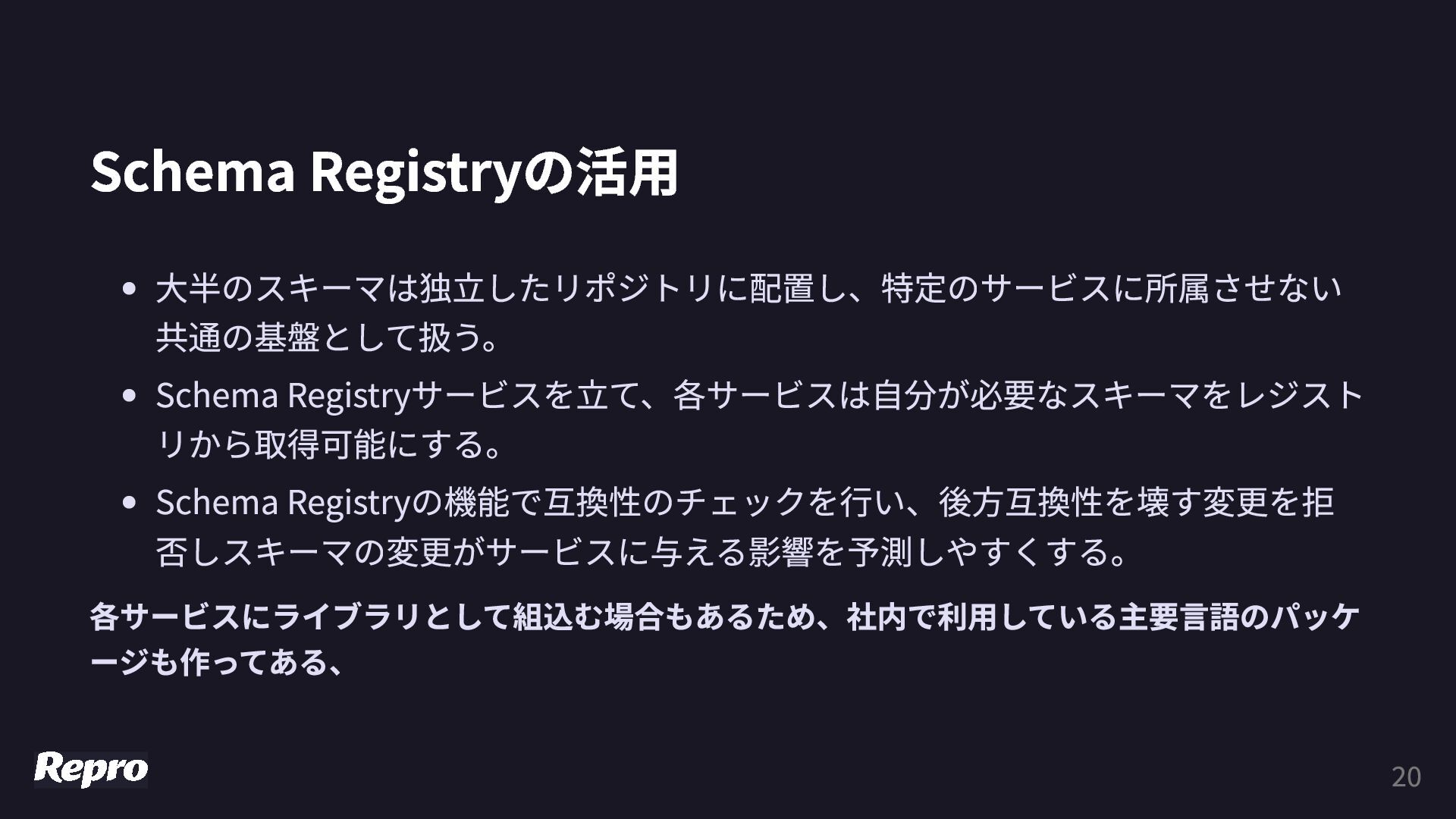 Schema Registryの活用 大半のスキーマは独立したリポジトリに配置し、特定のサービスに所属させない 共通の基盤として扱う。 Schema Registryサービスを立て、各サービスは自分が必要なスキーマをレジスト リから取得可能にする。 Schema Registryの機能で互換性のチェックを行い、後方互換性を壊す変更を拒 否しスキーマの変更がサービスに与える影響を予測しやすくする。