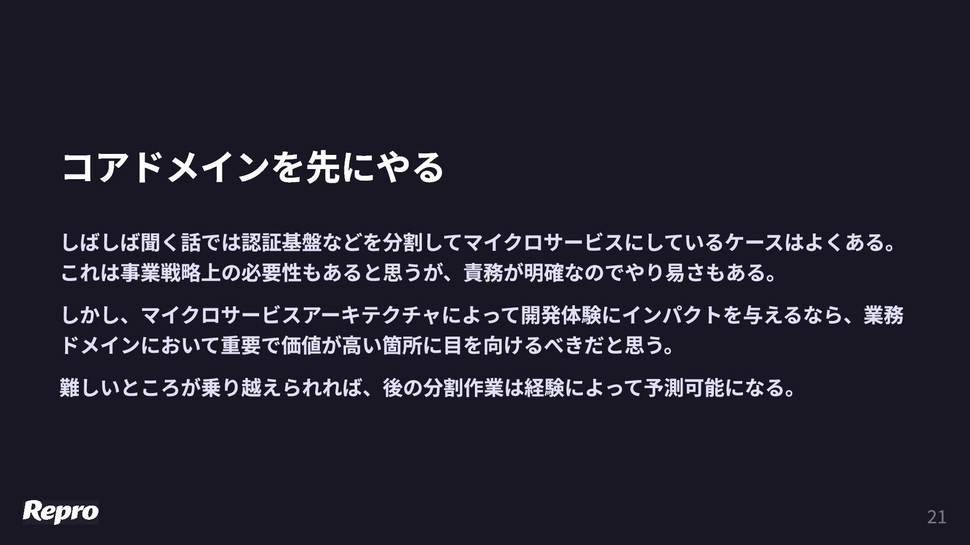 コアドメインを先にやる しばしば聞く話では認証基盤などを分割してマイクロサービスにしているケースはよくある。 これは事業戦略上の必要性もあると思うが、責務が明確なのでやり易さもある。 しかし、マイクロサービスアーキテクチャによって開発体験にインパクトを与えるなら、業務 ドメインにおいて重要で価値が高い箇所に目を向けるべきだと思う。 難しいところが乗り越えられれば、後の分割作業は経験によって予測可能になる。 21
