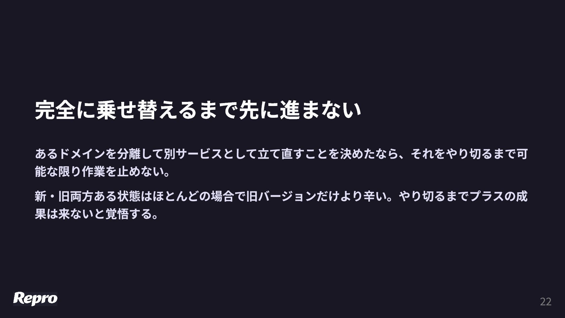 完全に乗せ替えるまで先に進まない あるドメインを分離して別サービスとして立て直すことを決めたなら、それをやり切るまで可 能な限り作業を止めない。 新・旧両方ある状態はほとんどの場合で旧バージョンだけより辛い。やり切るまでプラスの成 果は来ないと覚悟する。 22