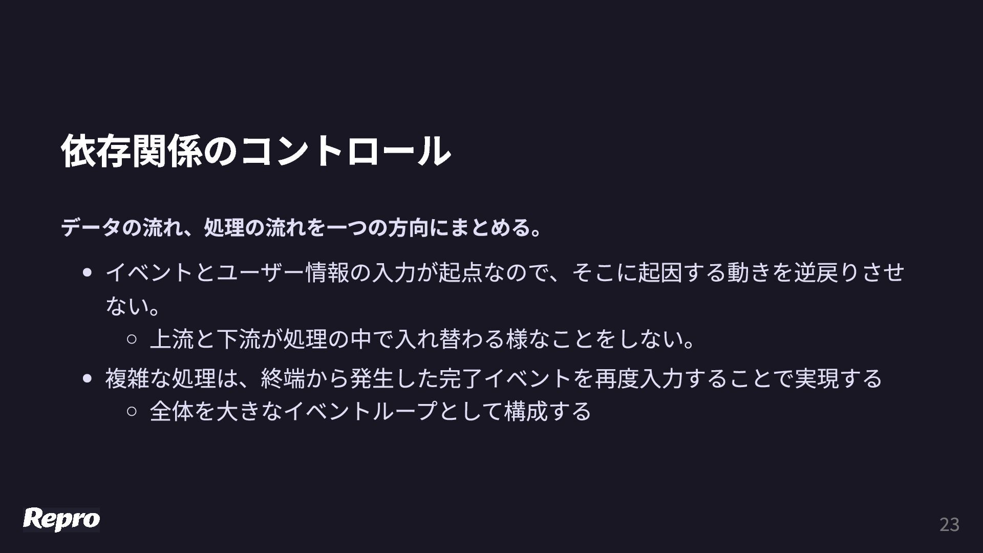 依存関係のコントロール データの流れ、処理の流れを一つの方向にまとめる。 イベントとユーザー情報の入力が起点なので、そこに起因する動きを逆戻りさせ ない。 上流と下流が処理の中で入れ替わる様なことをしない。 複雑な処理は、終端から発生した完了イベントを再度入力することで実現する 全体を大きなイベントループとして構成する 23