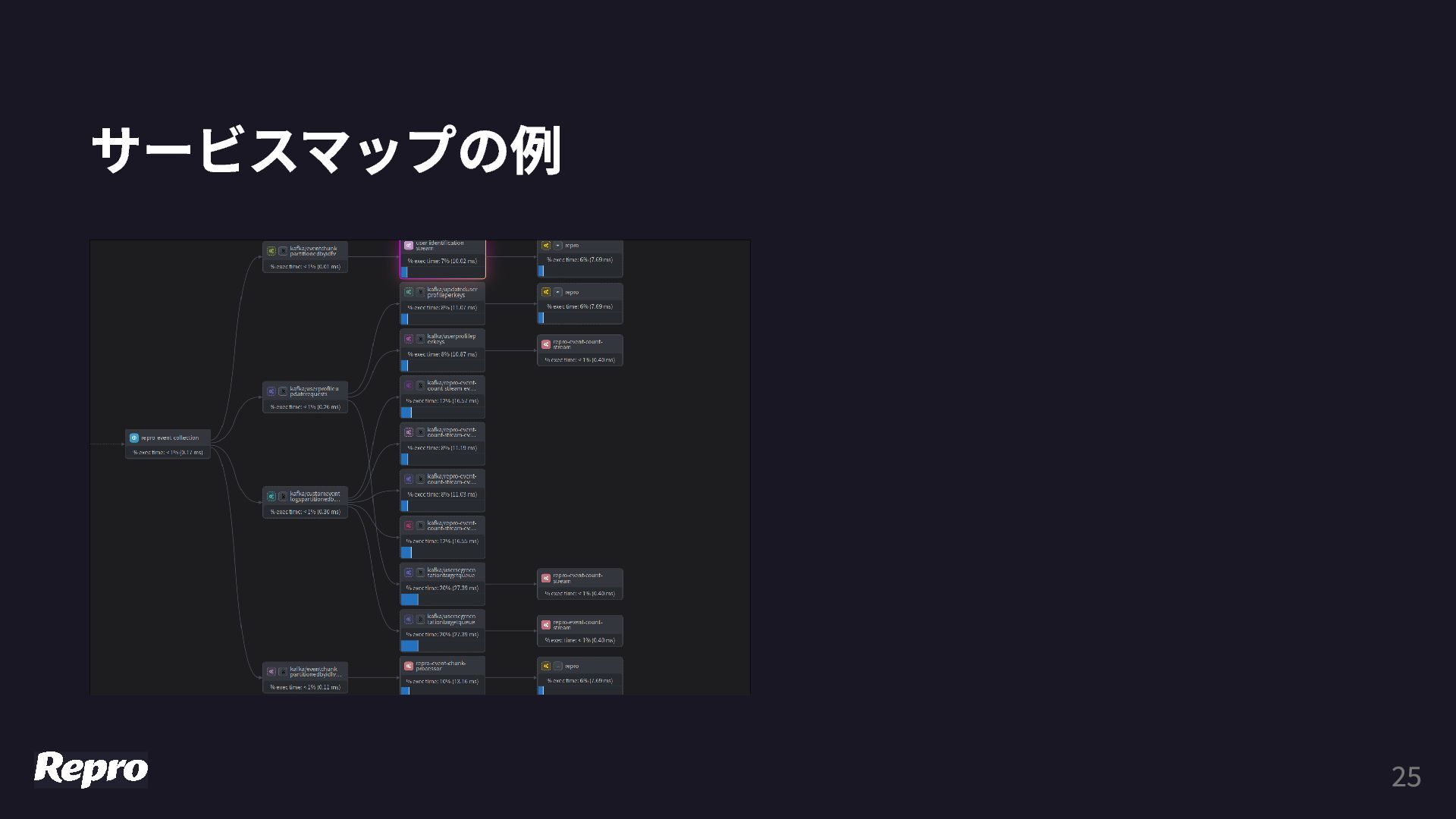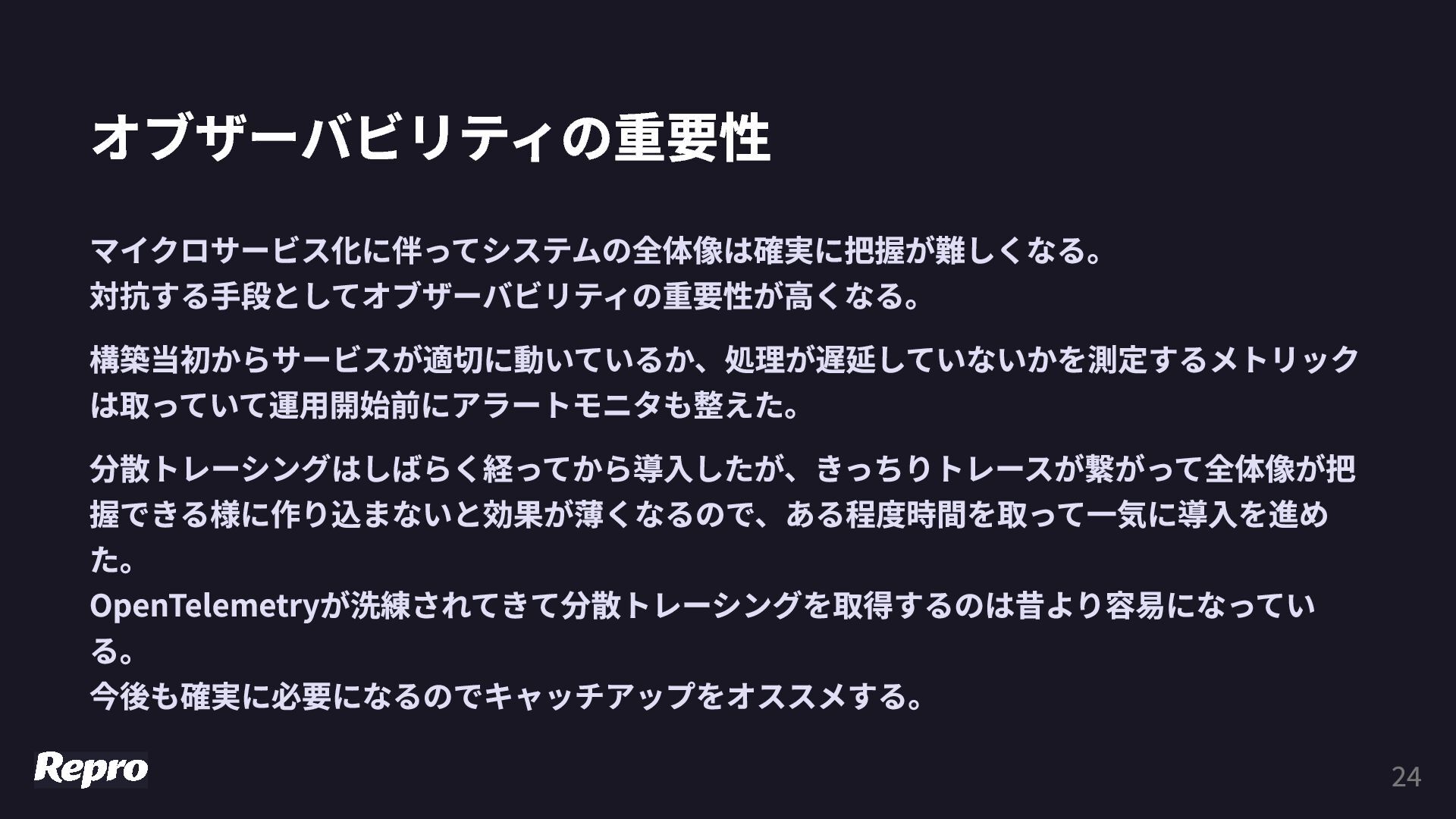 オブザーバビリティの重要性 マイクロサービス化に伴ってシステムの全体像は確実に把握が難しくなる。 対抗する手段としてオブザーバビリティの重要性が高くなる。 構築当初からサービスが適切に動いているか、処理が遅延していないかを測定するメトリック は取っていて運用開始前にアラートモニタも整えた。 分散トレーシングはしばらく経ってから導入したが、きっちりトレースが繋がって全体像が把 握できる様に作り込まないと効果が薄くなるので、ある程度時間を取って一気に導入を進め た。 OpenTelemetryが洗練されてきて分散トレーシングを取得するのは昔より容易になってい る。