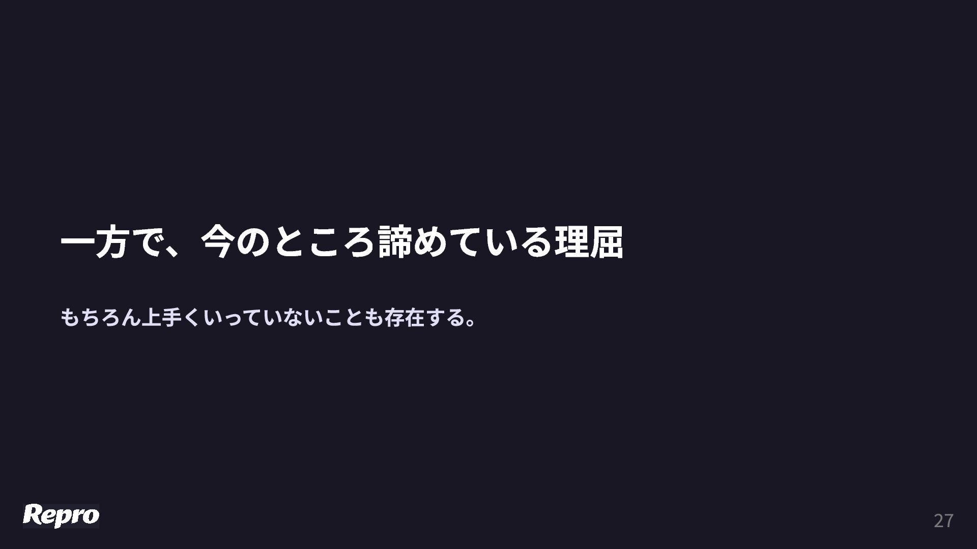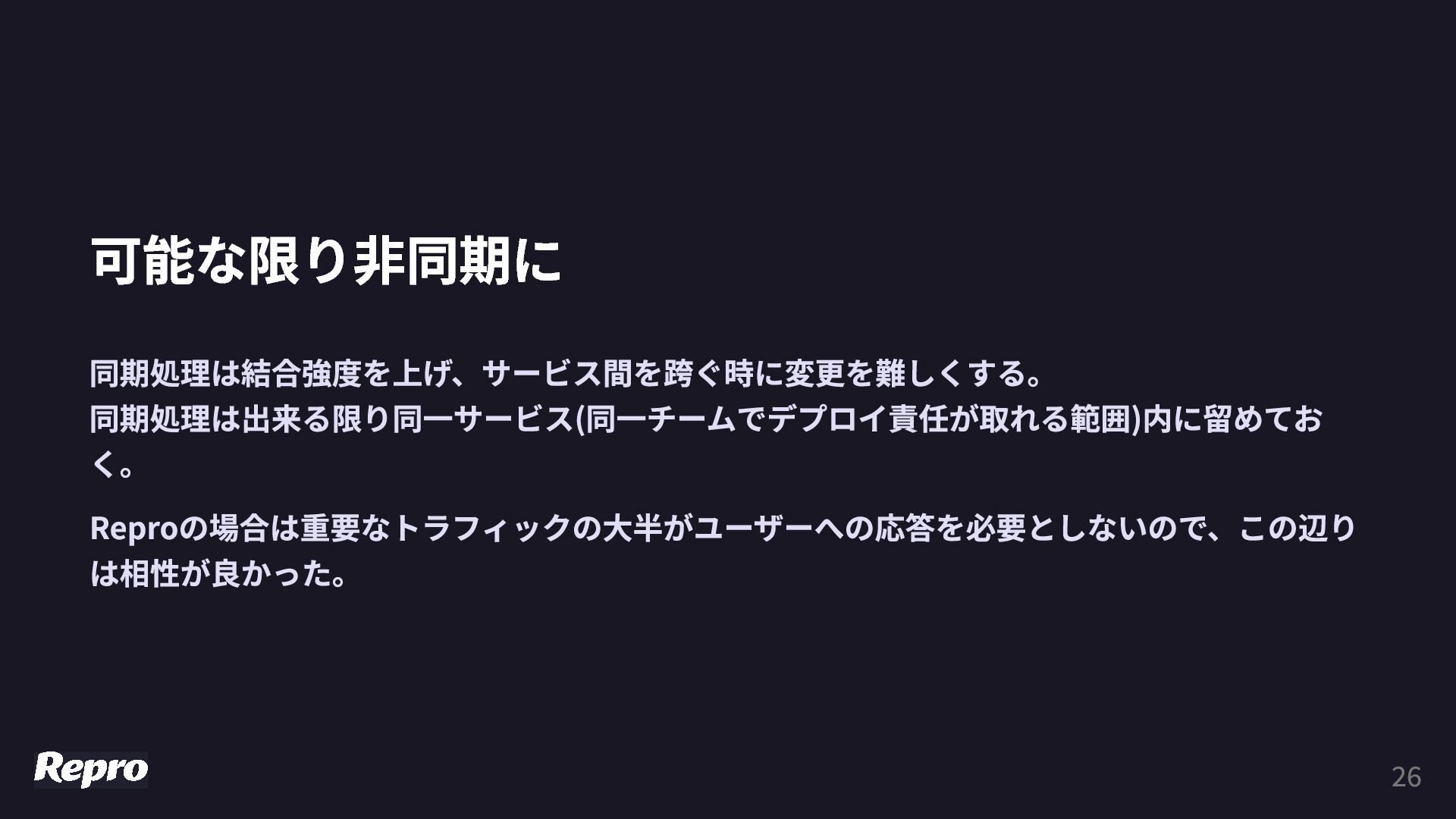 可能な限り非同期に 同期処理は結合強度を上げ、サービス間を跨ぐ時に変更を難しくする。 同期処理は出来る限り同一サービス(同一チームでデプロイ責任が取れる範囲)内に留めてお く。 Reproの場合は重要なトラフィックの大半がユーザーへの応答を必要としないので、この辺り は相性が良かった。 26