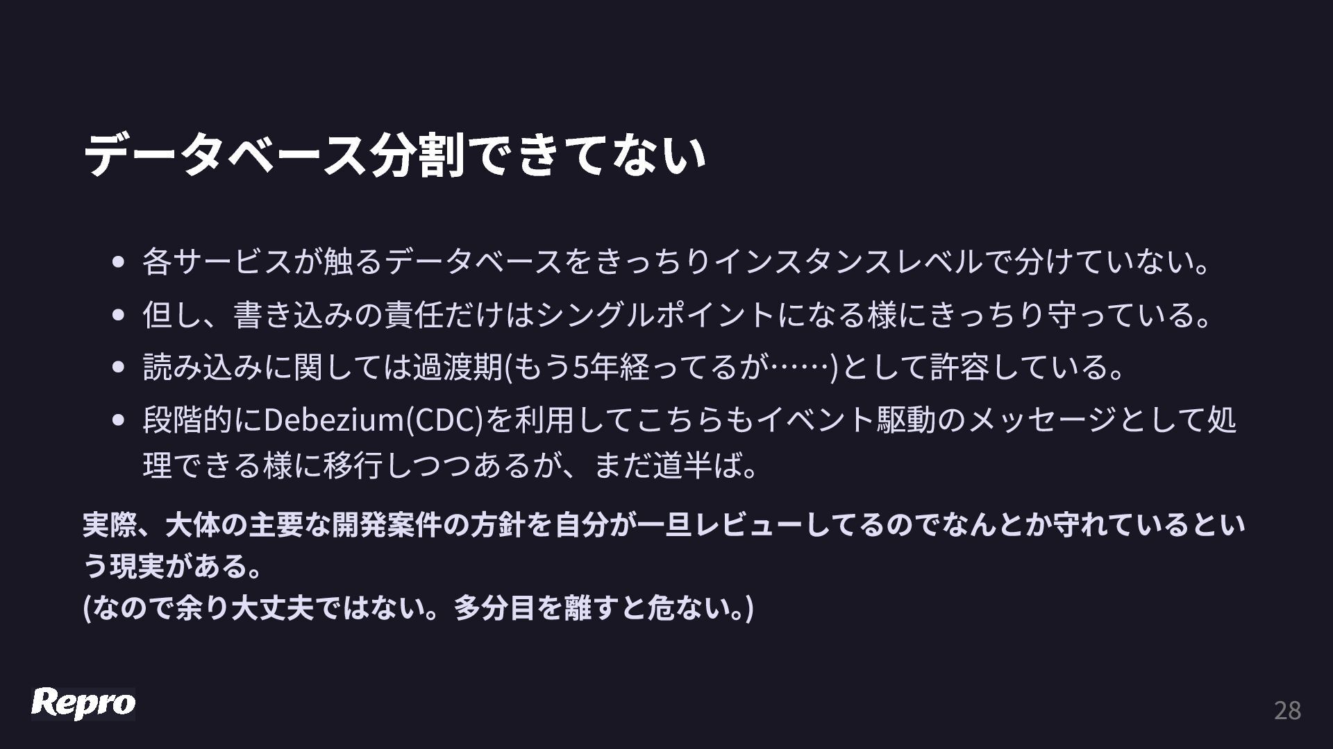 データベース分割できてない 各サービスが触るデータベースをきっちりインスタンスレベルで分けていない。 但し、書き込みの責任だけはシングルポイントになる様にきっちり守っている。 読み込みに関しては過渡期(もう5年経ってるが……)として許容している。 段階的にDebezium(CDC)を利用してこちらもイベント駆動のメッセージとして処 理できる様に移行しつつあるが、まだ道半ば。 実際、大体の主要な開発案件の方針を自分が一旦レビューしてるのでなんとか守れているとい う現実がある。 (なので余り大丈夫ではない。多分目を離すと危ない。 )