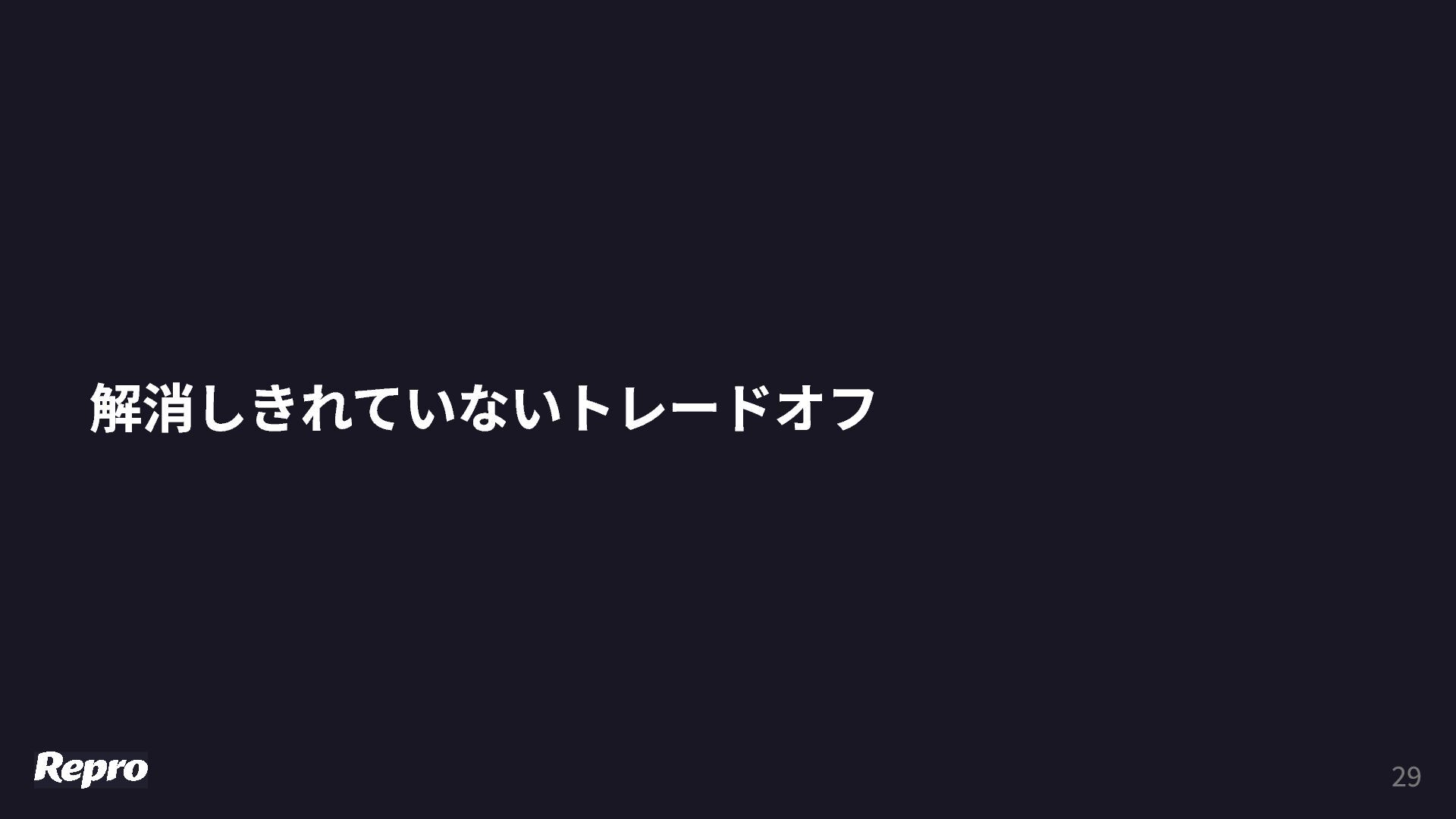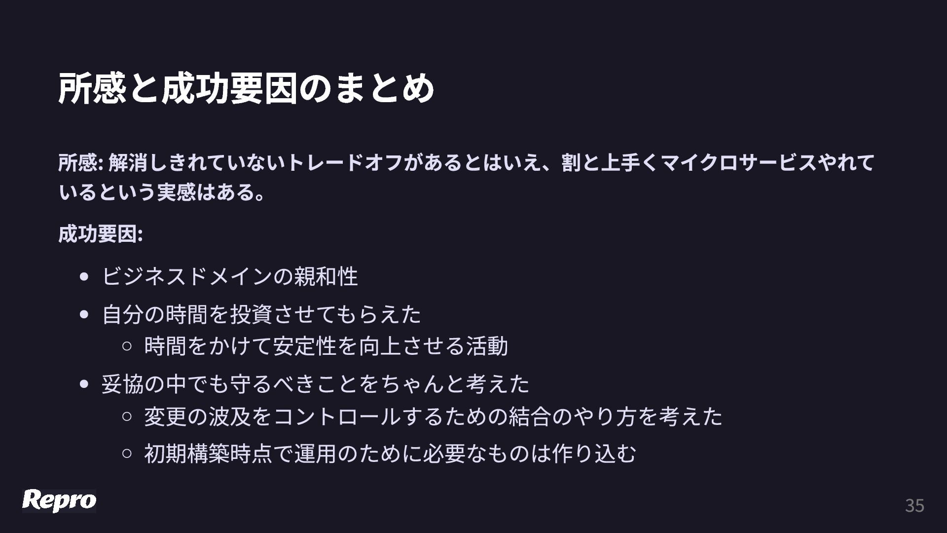 所感と成功要因のまとめ 所感: 解消しきれていないトレードオフがあるとはいえ、割と上手くマイクロサービスやれて いるという実感はある。 成功要因: ビジネスドメインの親和性 自分の時間を投資させてもらえた 時間をかけて安定性を向上させる活動 妥協の中でも守るべきことをちゃんと考えた 変更の波及をコントロールするための結合のやり方を考えた