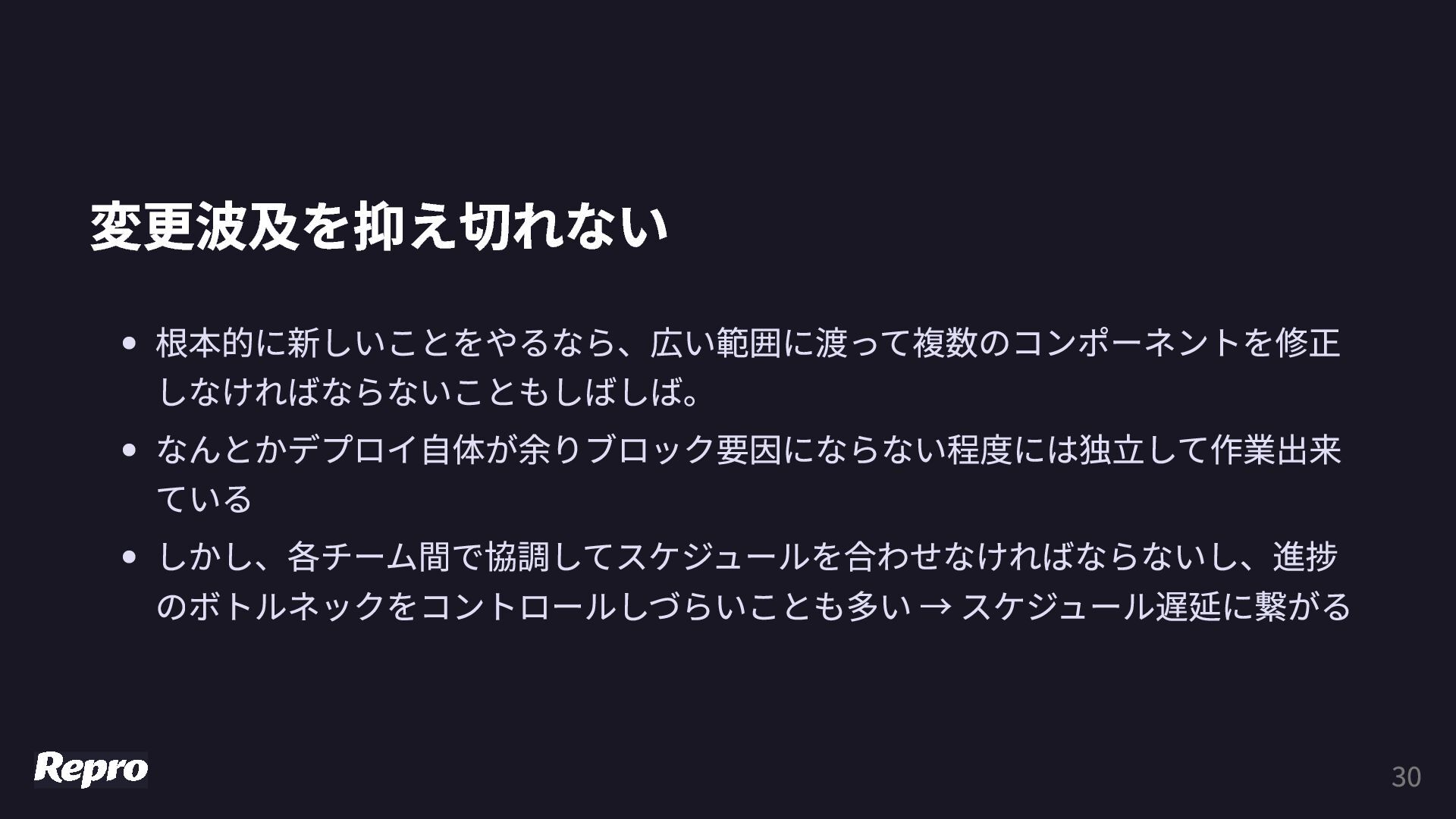 変更波及を抑え切れない 根本的に新しいことをやるなら、広い範囲に渡って複数のコンポーネントを修正 しなければならないこともしばしば。 なんとかデプロイ自体が余りブロック要因にならない程度には独立して作業出来 ている しかし、各チーム間で協調してスケジュールを合わせなければならないし、進捗 のボトルネックをコントロールしづらいことも多い → スケジュール遅延に繋がる 30