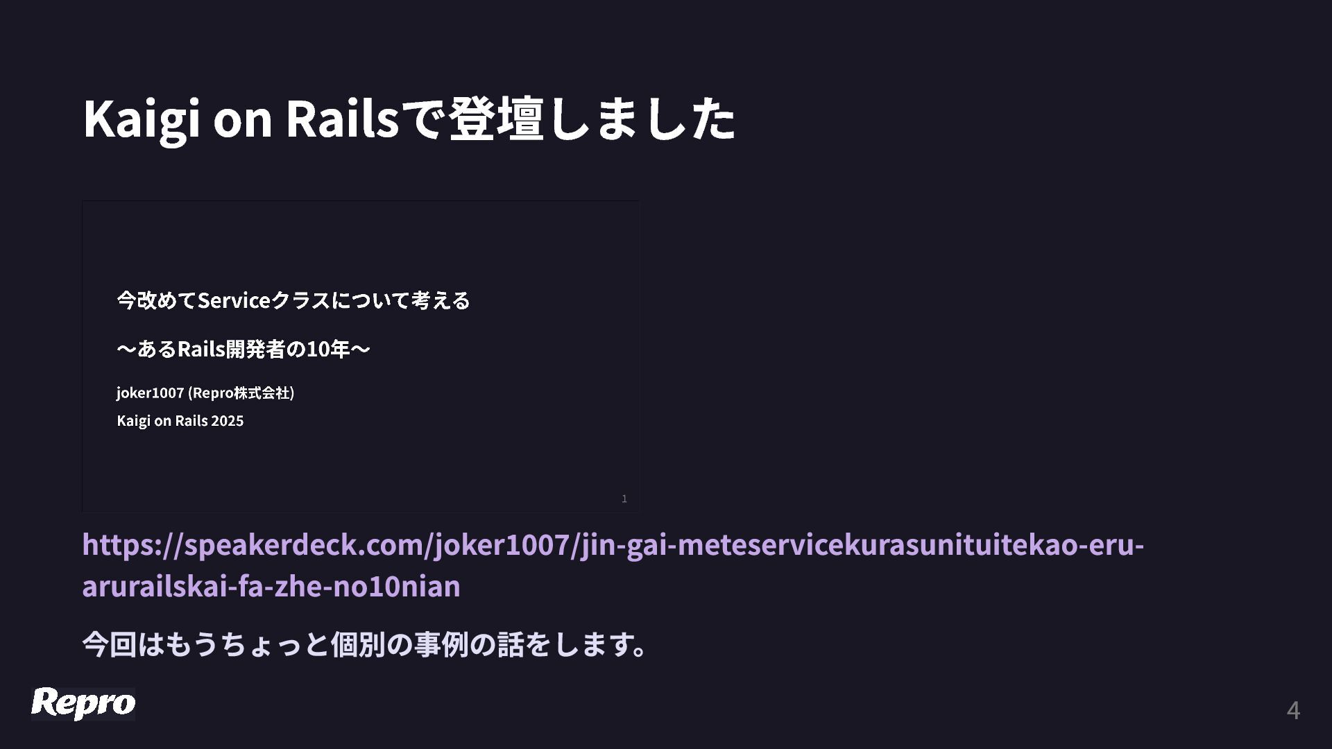 Kaigi on Railsで登壇しました https://speakerdeck.com/joker1007/jin-gai-meteservicekurasunituitekao-eru- arurailskai-fa-zhe-no10nian 今回はもうちょっと個別の事例の話をします。 4