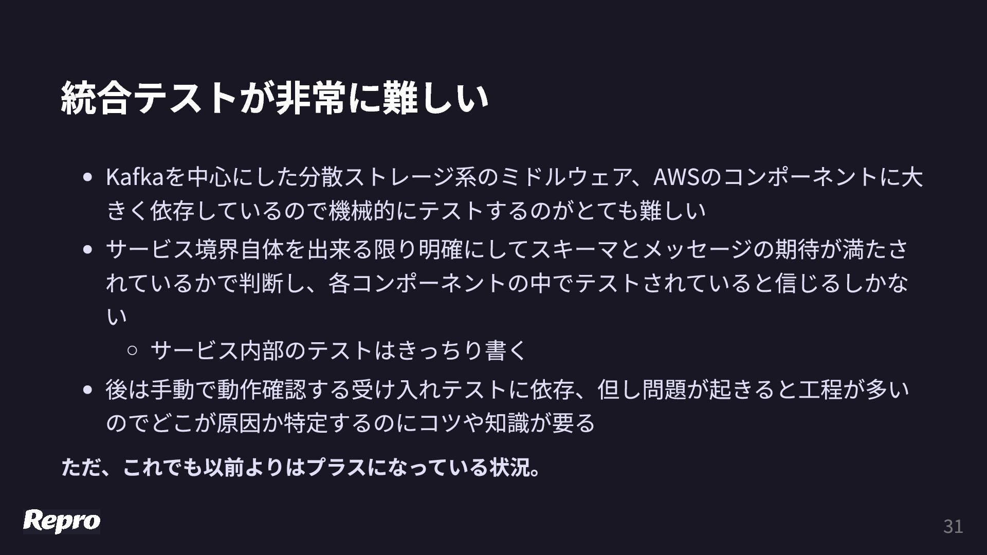 統合テストが非常に難しい Kafkaを中心にした分散ストレージ系のミドルウェア、AWSのコンポーネントに大 きく依存しているので機械的にテストするのがとても難しい サービス境界自体を出来る限り明確にしてスキーマとメッセージの期待が満たさ れているかで判断し、各コンポーネントの中でテストされていると信じるしかな い サービス内部のテストはきっちり書く 後は手動で動作確認する受け入れテストに依存、但し問題が起きると工程が多い のでどこが原因か特定するのにコツや知識が要る ただ、これでも以前よりはプラスになっている状況。