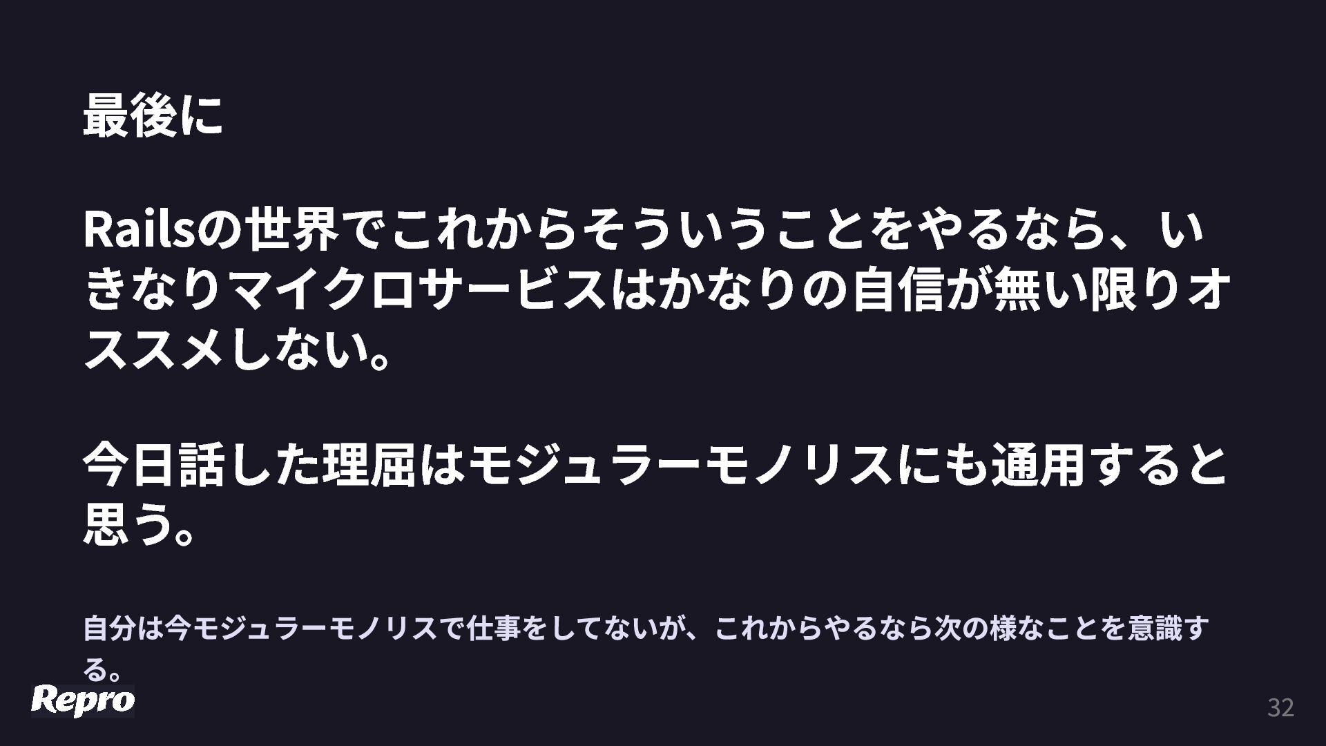 最後に Railsの世界でこれからそういうことをやるなら、い きなりマイクロサービスはかなりの自信が無い限りオ ススメしない。 今日話した理屈はモジュラーモノリスにも通用すると 思う。 自分は今モジュラーモノリスで仕事をしてないが、これからやるなら次の様なことを意識す る。 32