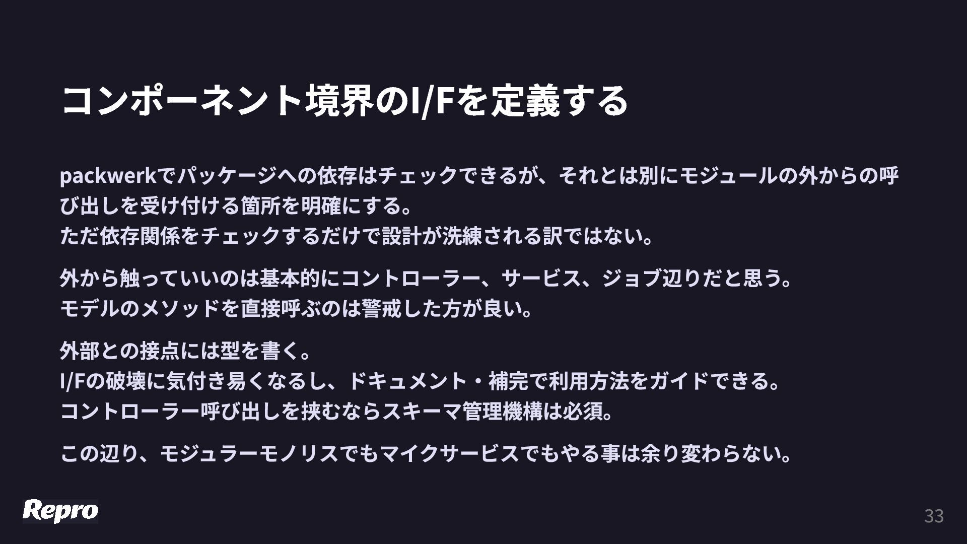 コンポーネント境界のI/Fを定義する packwerkでパッケージへの依存はチェックできるが、それとは別にモジュールの外からの呼 び出しを受け付ける箇所を明確にする。 ただ依存関係をチェックするだけで設計が洗練される訳ではない。 外から触っていいのは基本的にコントローラー、サービス、ジョブ辺りだと思う。 モデルのメソッドを直接呼ぶのは警戒した方が良い。 外部との接点には型を書く。 I/Fの破壊に気付き易くなるし、ドキュメント・補完で利用方法をガイドできる。 コントローラー呼び出しを挟むならスキーマ管理機構は必須。 この辺り、モジュラーモノリスでもマイクサービスでもやる事は余り変わらない。