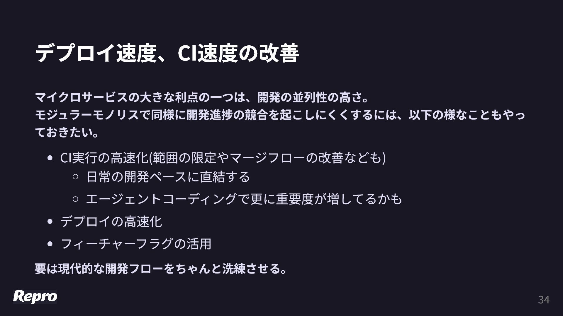 デプロイ速度、CI速度の改善 マイクロサービスの大きな利点の一つは、開発の並列性の高さ。 モジュラーモノリスで同様に開発進捗の競合を起こしにくくするには、以下の様なこともやっ ておきたい。 CI実行の高速化(範囲の限定やマージフローの改善なども) 日常の開発ペースに直結する エージェントコーディングで更に重要度が増してるかも デプロイの高速化 フィーチャーフラグの活用 要は現代的な開発フローをちゃんと洗練させる。