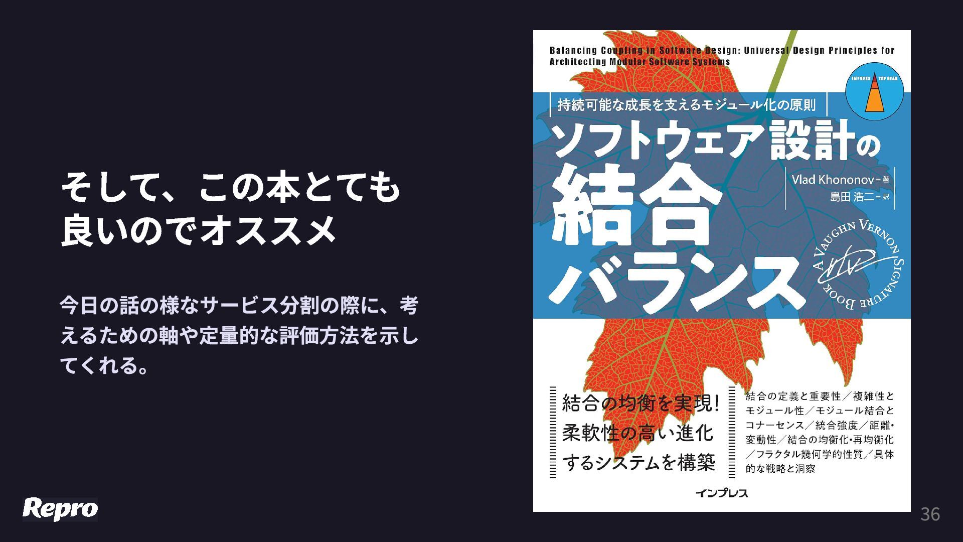 そして、この本とても 良いのでオススメ 今日の話の様なサービス分割の際に、考 えるための軸や定量的な評価方法を示し てくれる。 36