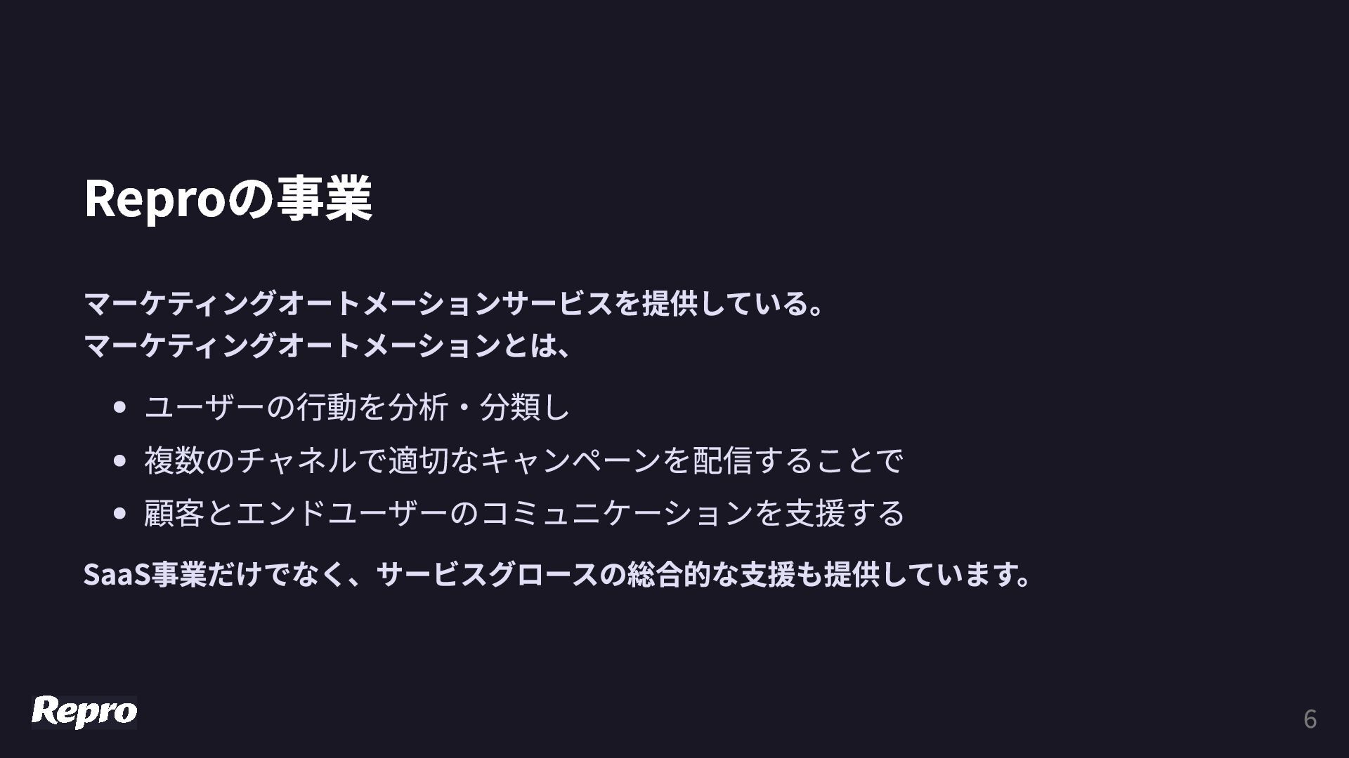 Reproの事業 マーケティングオートメーションサービスを提供している。 マーケティングオートメーションとは、 ユーザーの行動を分析・分類し 複数のチャネルで適切なキャンペーンを配信することで 顧客とエンドユーザーのコミュニケーションを支援する SaaS事業だけでなく、サービスグロースの総合的な支援も提供しています。 6