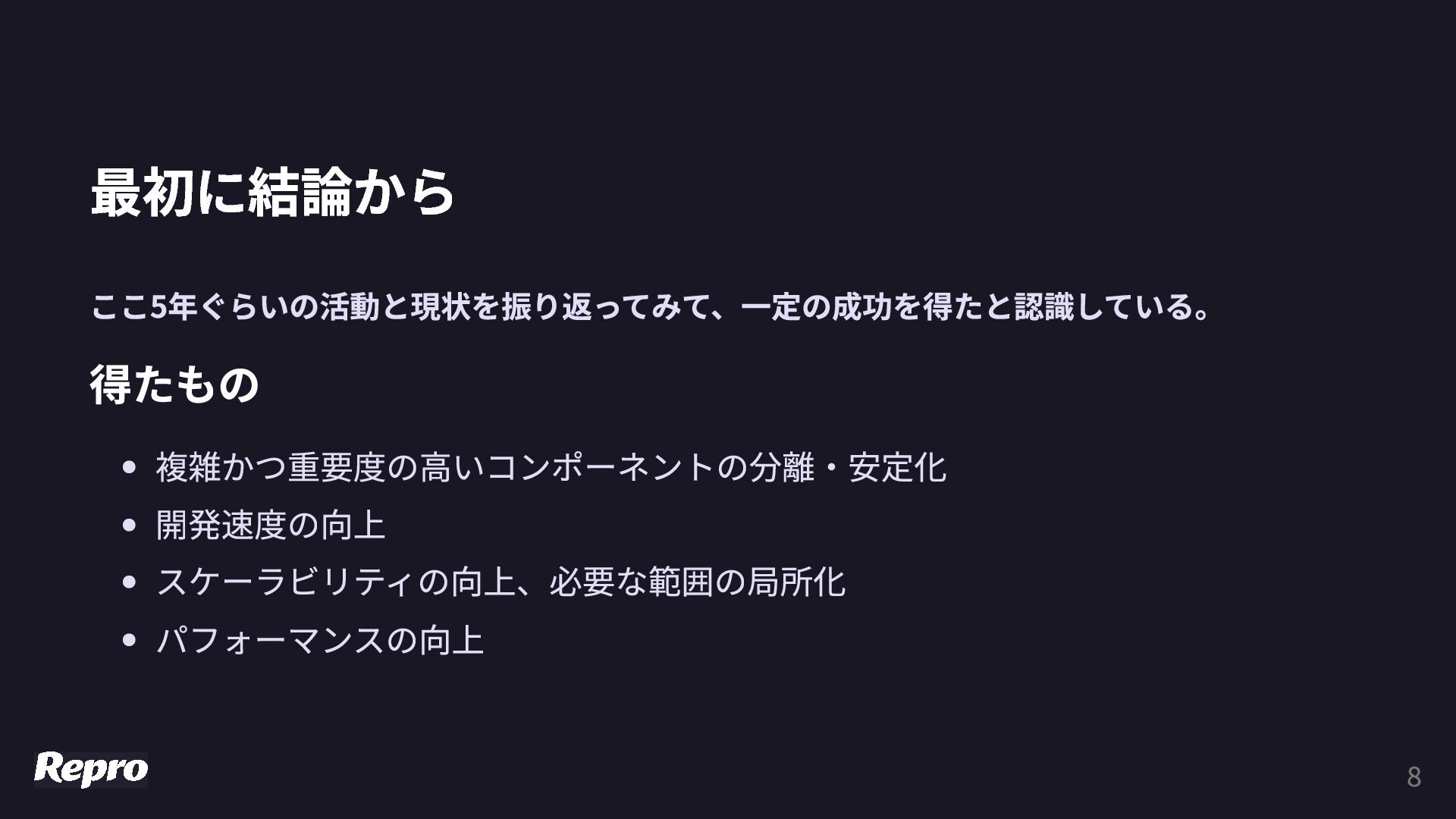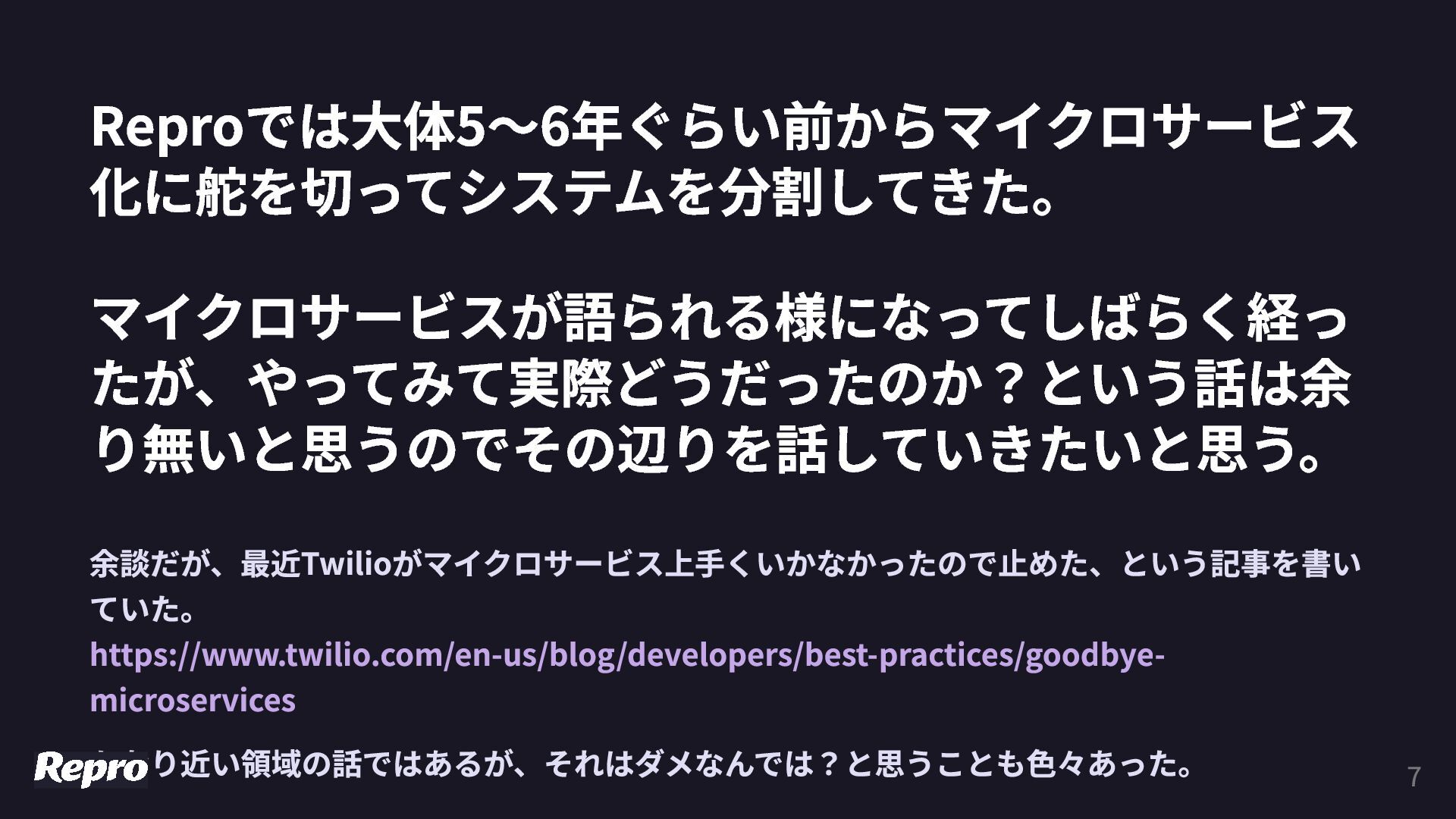Reproでは大体5〜6年ぐらい前からマイクロサービス 化に舵を切ってシステムを分割してきた。 マイクロサービスが語られる様になってしばらく経っ たが、やってみて実際どうだったのか?という話は余 り無いと思うのでその辺りを話していきたいと思う。 余談だが、最近Twilioがマイクロサービス上手くいかなかったので止めた、という記事を書い ていた。 https://www.twilio.com/en-us/blog/developers/best-practices/goodbye- microservices かなり近い領域の話ではあるが、それはダメなんでは?と思うことも色々あった。