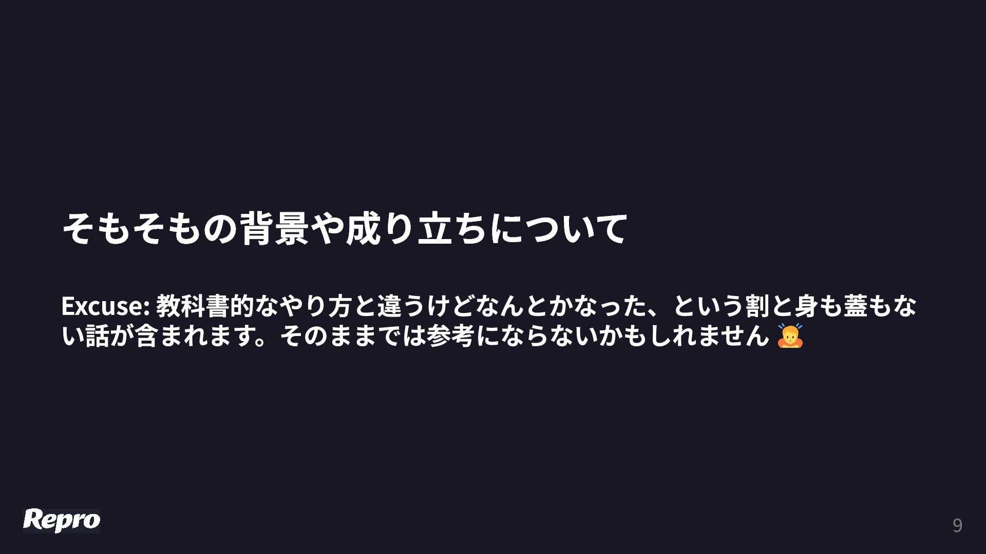 そもそもの背景や成り立ちについて Excuse: 教科書的なやり方と違うけどなんとかなった、という割と身も蓋もな い話が含まれます。そのままでは参考にならないかもしれません 9