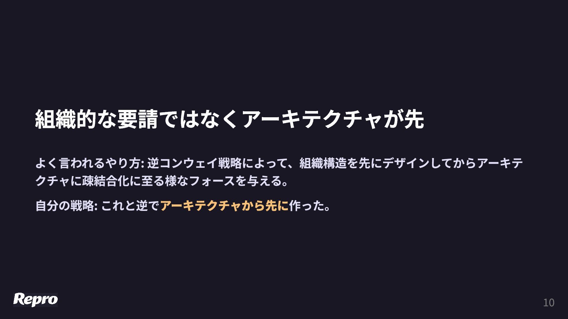 組織的な要請ではなくアーキテクチャが先 よく言われるやり方: 逆コンウェイ戦略によって、組織構造を先にデザインしてからアーキテ クチャに疎結合化に至る様なフォースを与える。 自分の戦略: これと逆でアーキテクチャから先に作った。 10