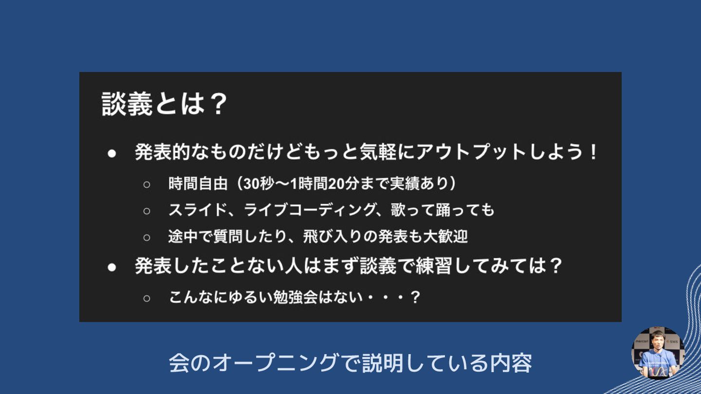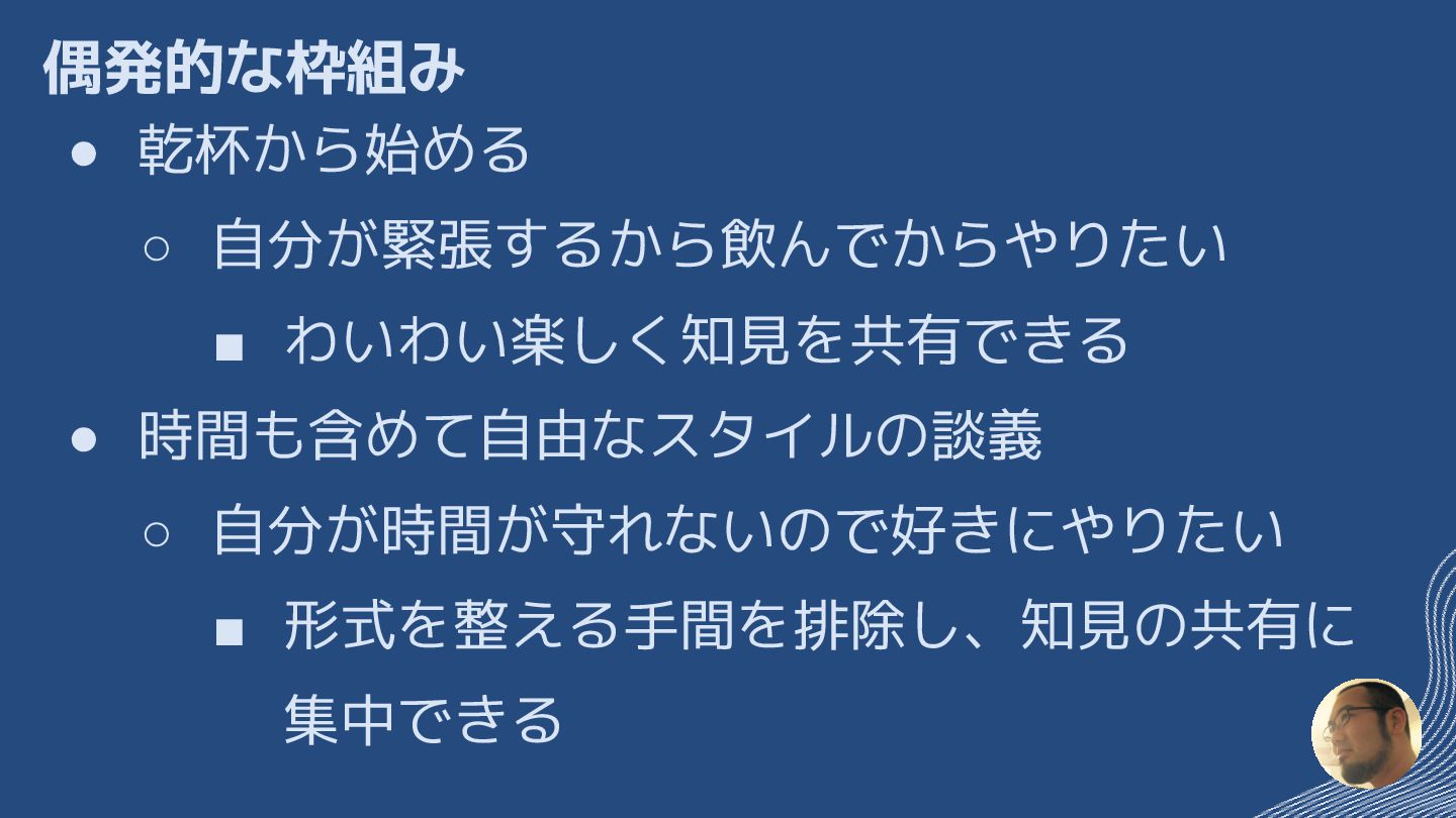 • 乾杯から始める ◦ 自分が緊張するから飲んでからやりたい ▪ わいわい楽しく知見を共有できる • 時間も含めて自由なスタイルの談義 ◦ 自分が時間が守れないので好きにやりたい