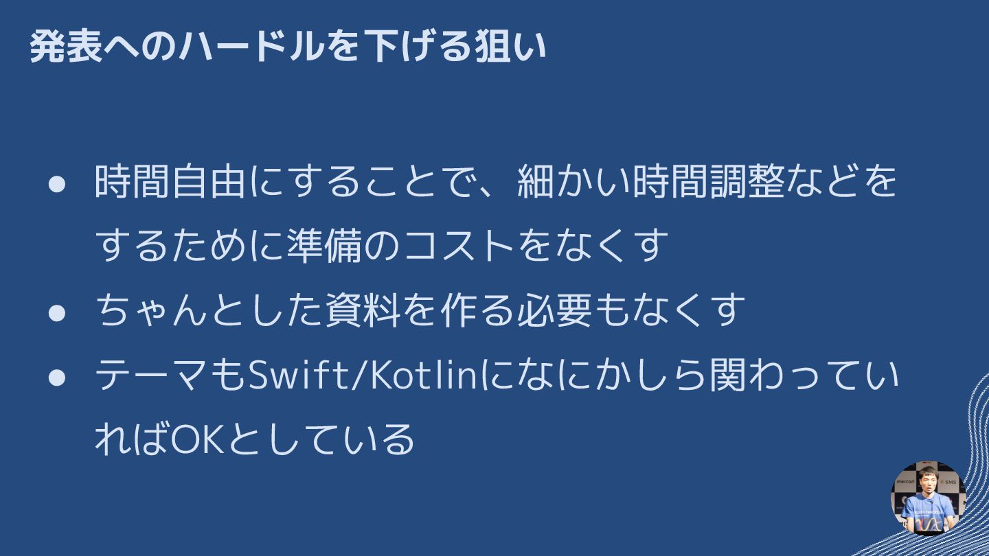 発表へのハードルを下げる狙い • 時間自由にすることで、細かい時間調整などを するために準備のコストをなくす • ちゃんとした資料を作る必要もなくす • テーマもSwift/Kotlinになにかしら関わってい ればOKとしている