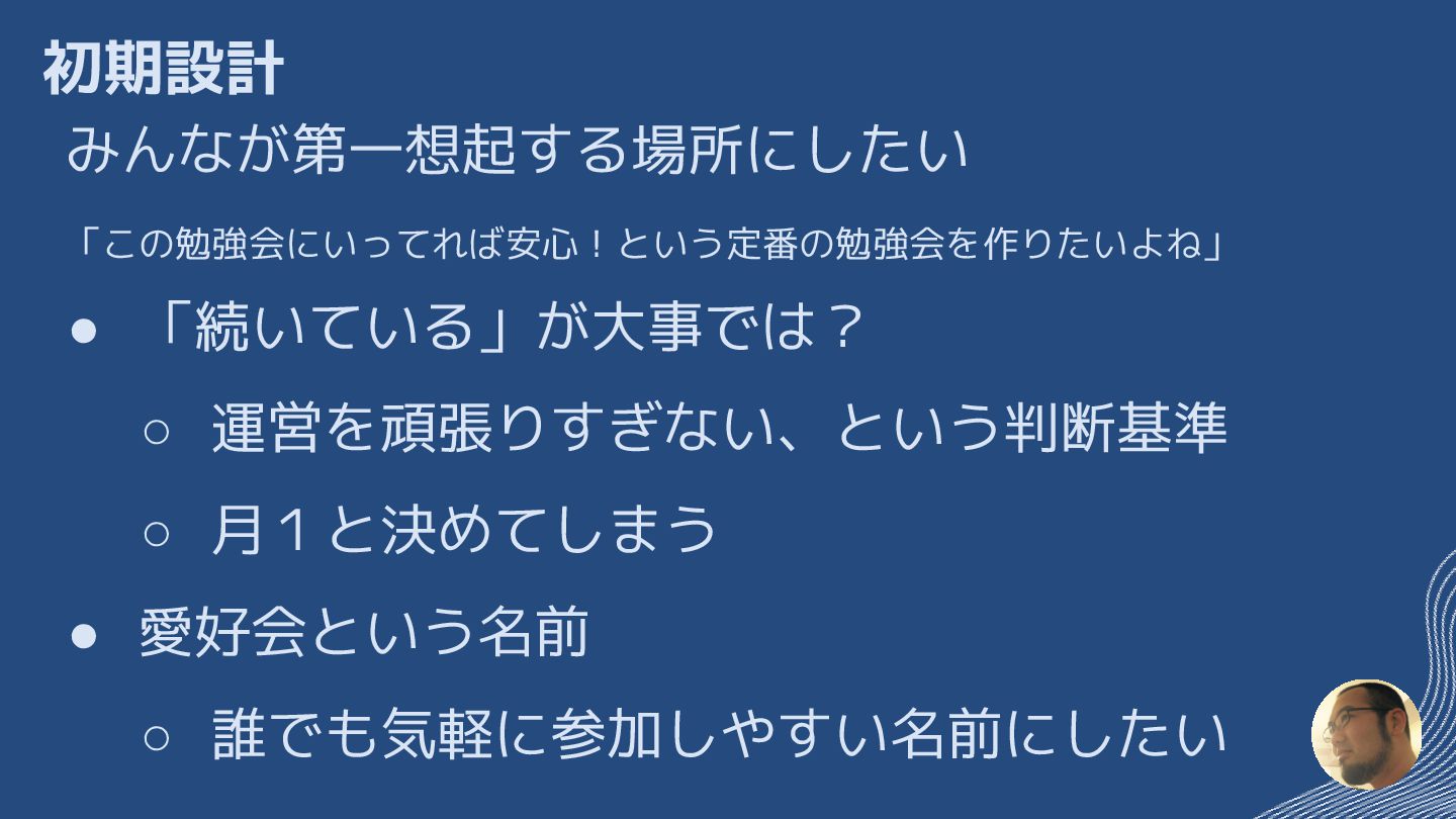 みんなが第一想起する場所にしたい 「この勉強会にいってれば安心!という定番の勉強会を作りたいよね」 • 「続いている」が大事では? ◦ 運営を頑張りすぎない、という判断基準 ◦ 月1と決めてしまう • 愛好会という名前